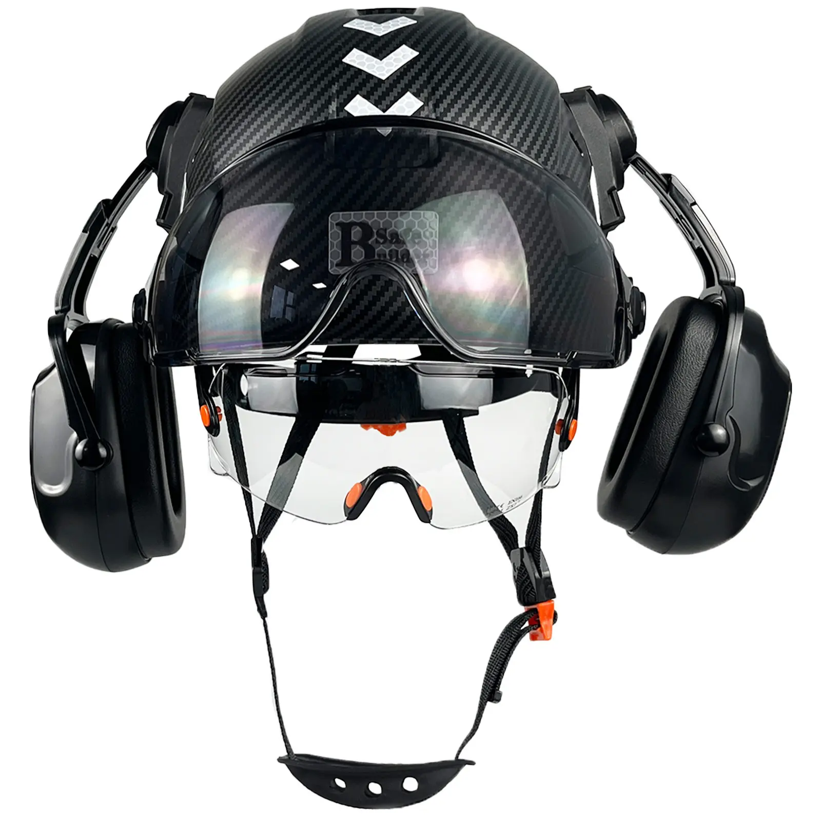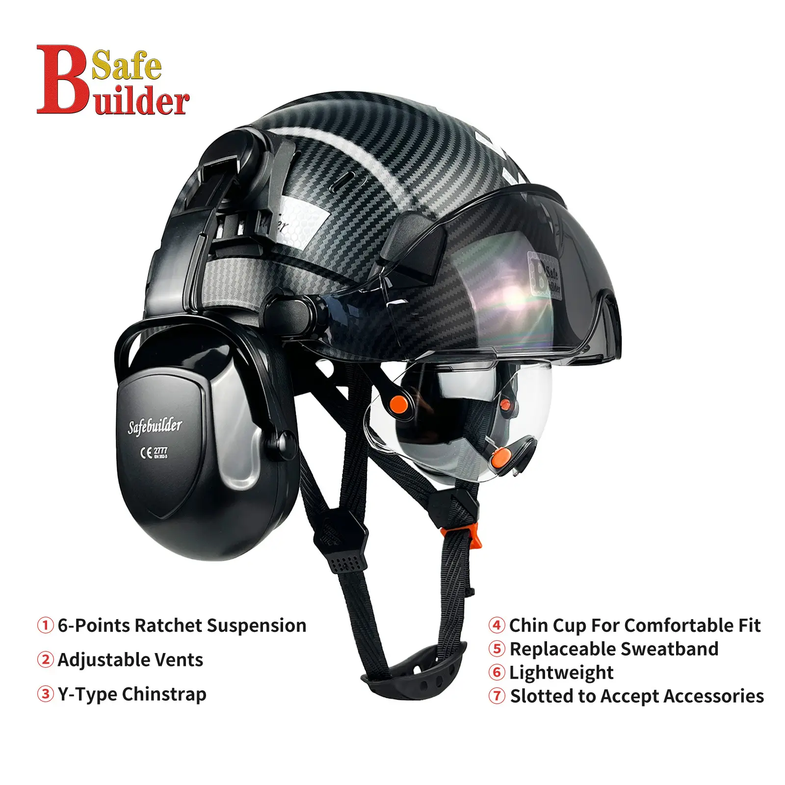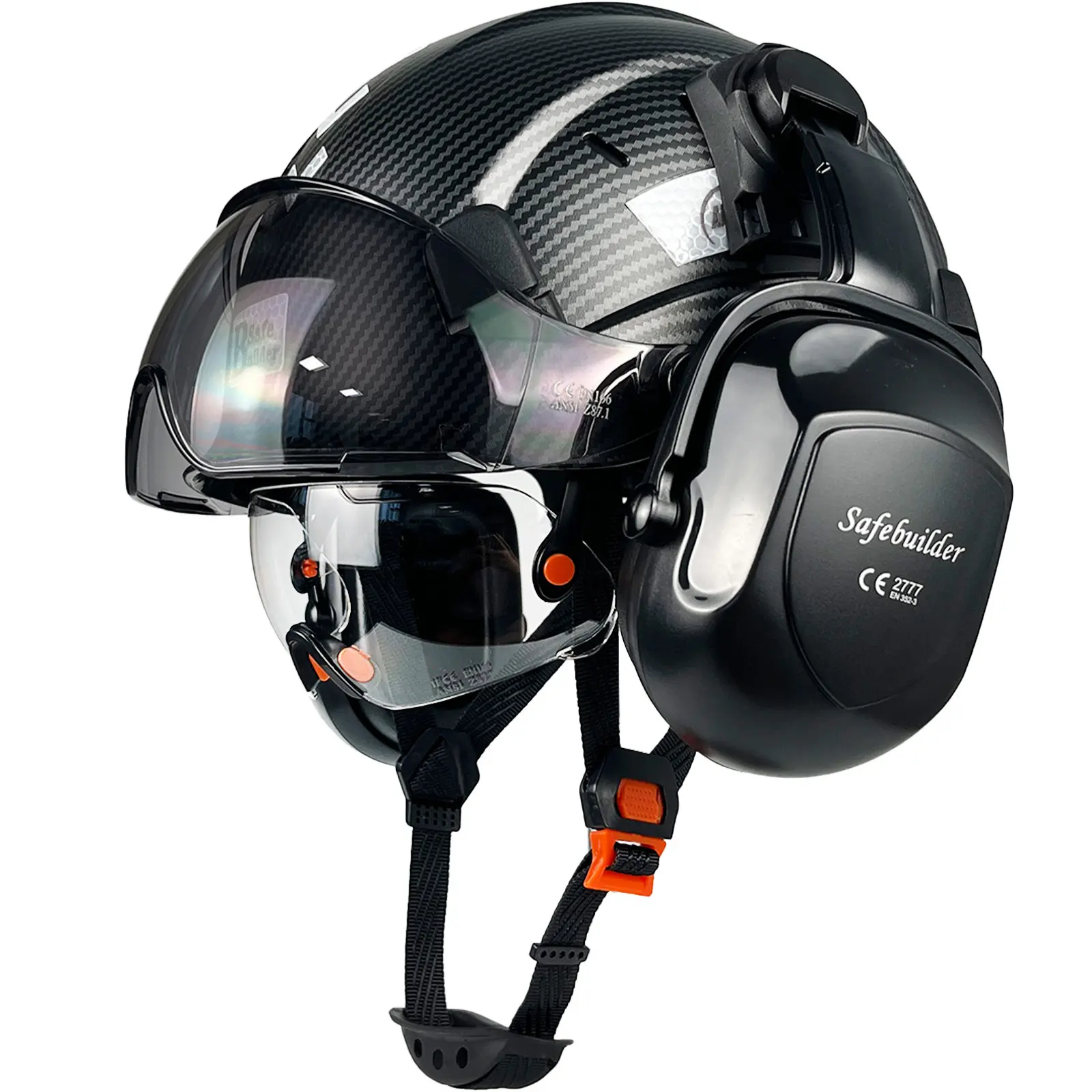 CE Carbon Fiber Pattern Safety Helmet With Build in Visor Earmuff and Reflective Stickers For Engineer ABS Construction Hard Hat