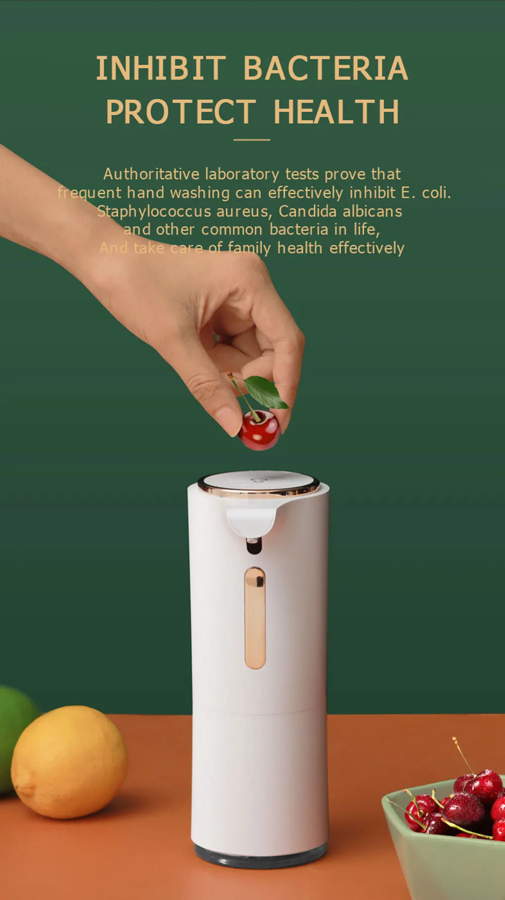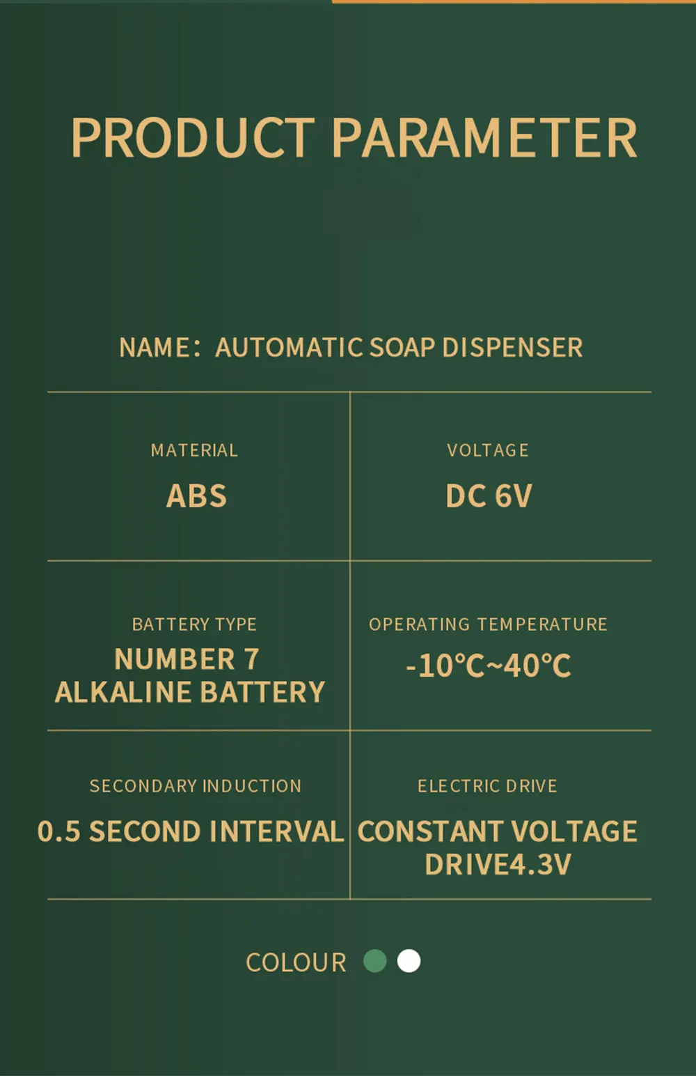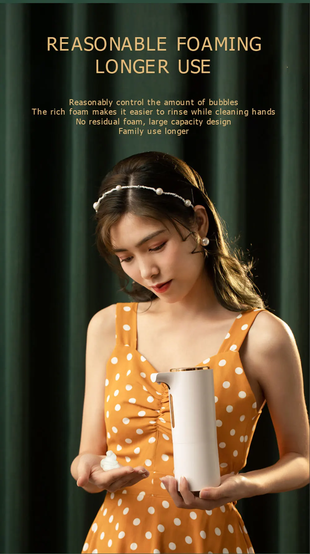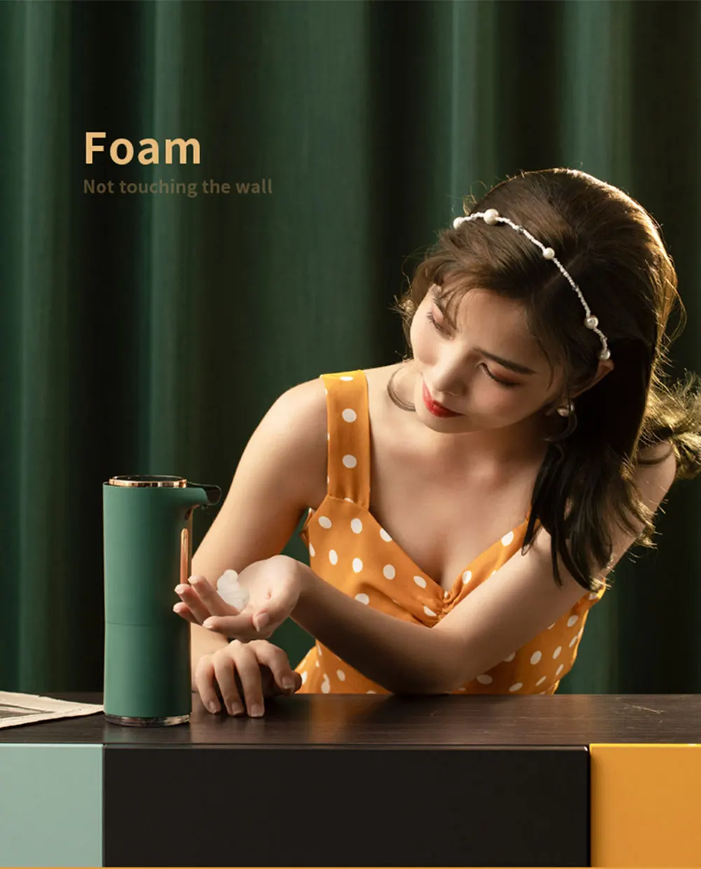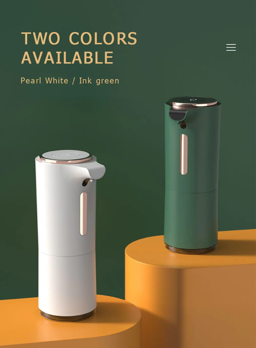 2.Our product has only one sensor button, no need to press, put your finger on it for 2 seconds to switch on/off.White flashes once to indicate that the device is on, and red flashes three times to indicate that it is off.Our foaming soap dispenser is equipped with unique gear design, high efficiency pump and rubber shock absorption structure, which can quickly and evenly distribute the soap dispenser within 0.2 seconds with low noise.