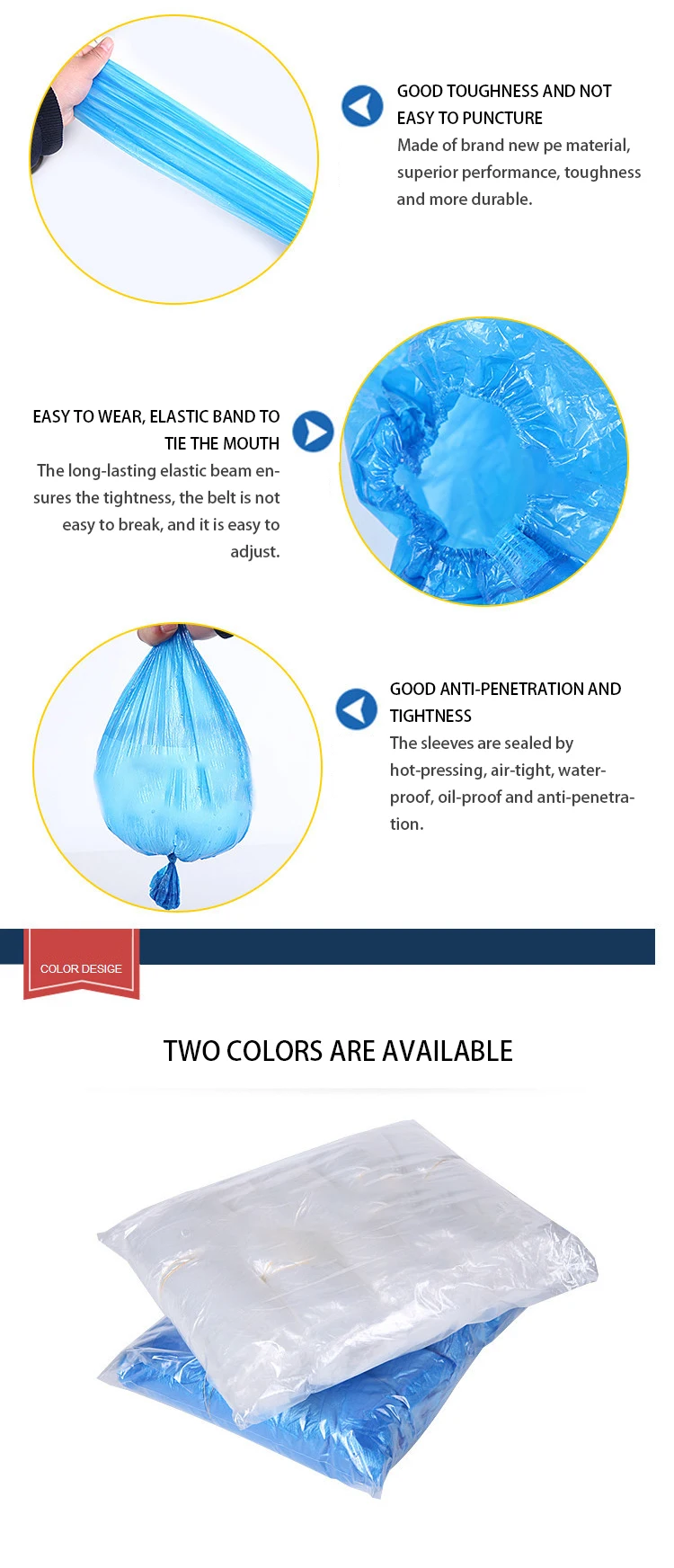 Product features: Adopt new material Pe material, flexible, light weight. Non-toxic, non-irritating, waterproof, oil-proof and dust-proof, convenient and practical, safer and more hygienic.