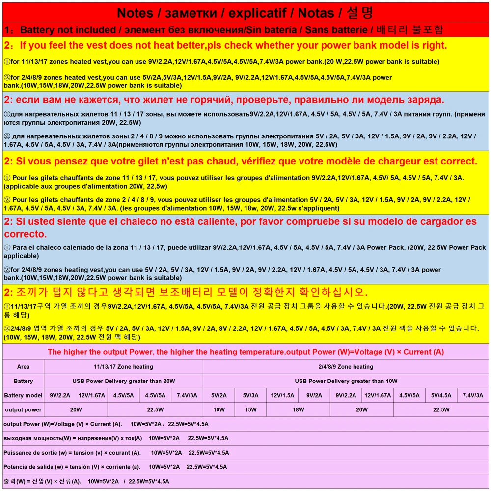 ②for 2/4/8/9 zones heated vest,you can use 5V/2A,5V/3A,12V/1.5A,9V/2A, 9V/2.2A,12V/1.67A,4.5V/5A,4.5V/5A,7.4V/3A power bank.(10W,15W,18W,20W,22.5W power bank is suitable for 2/4/8/9 zones heated vest)