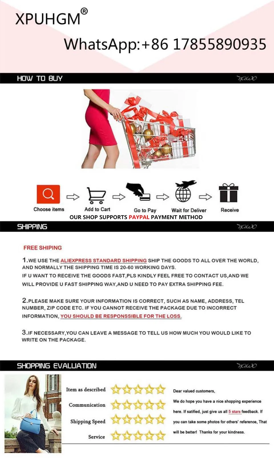 This is the special link for our VIP customer. To most of countries delivery time: 10-15 days and wholesale are supported, we care about your time so we try our best to make your shopping experience pleasant, seamless and hassle-free. We hope you’ll like it as much as we do and have a great shopping experience here. For wholesale please feel free to contact us to get best price. Our warehouse team and the logistics will be working 24/7 to get your items to you, please be assured we are doing everything we can to dispatch your parcels to your customer as soon as possible. Customer: how many orders can you handle a day? A: we can process 1,000 orders a day. Customer: how about the quality of your products? A: our team has professional inspectors who will check every product before shipping it to the customer. Customer: what should I do if I have a problem and want to ask you?Do you have WhatsApp? A: yes, my WhatsApp: +86 17855890935. Customer: do you support PAYPAL payment? A: yes, we have already opened the PAYPAL payment method. Customer: Do you run out of stock of some products? A: We have our own factory, the supply is very good, please don’t worry! Customer: What could you do when the products are arrived broken or even didn’t arrive the buyer? A: We will re-deliver or return the money to you according to the actual situation! Customer: How fast can you process orders? A:All orders will be processed within 48 hours! You can use our pictures for free, we have a professional package team, we can quickly handle the order of the day.