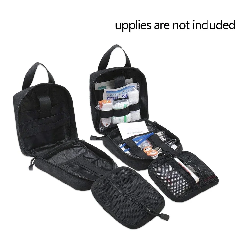 Features:<;br/>Premium material and sturdy double stitching strengthen the function of waterproof and anti corrosion, it is sturdy and durable as well as comfortable. <;br/>Multiple tight and elastic straps and a spacious pocket is enough to store your vital supplies. <;br/>Interior pockets for holding money, credit cards, pens, and other small personal items. <;br/>Easy to carry around in any environment. <;br/>Suitable for travel, camping, climbing and other outdoor activities.<;br/>Descriptions:<;br/>Dual zippers and copper snaps on the straps to keep your pouch securely attached. <;br/>Rip away panel feature and a wide handle for rapid removal makes it a snap to render first aid quickly. <;br/>Perfect for carrying medical supplies, suitable for men and women.<;br/><;br/>Package included:<;br/>1 x Outdoor Tactical Medical Bag