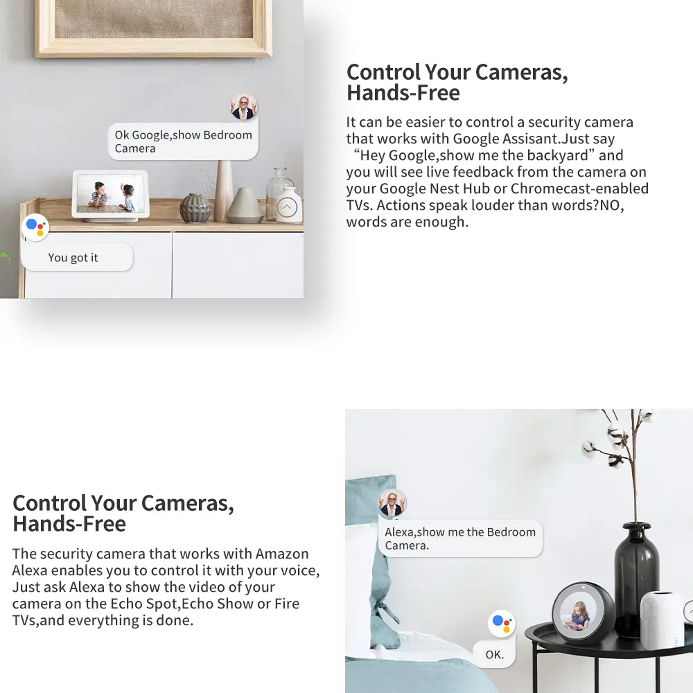 – Default support Alexa/Google Press Announcement. Need support Alexa/Google Live View, please buy the SKU with “Alexa” words.