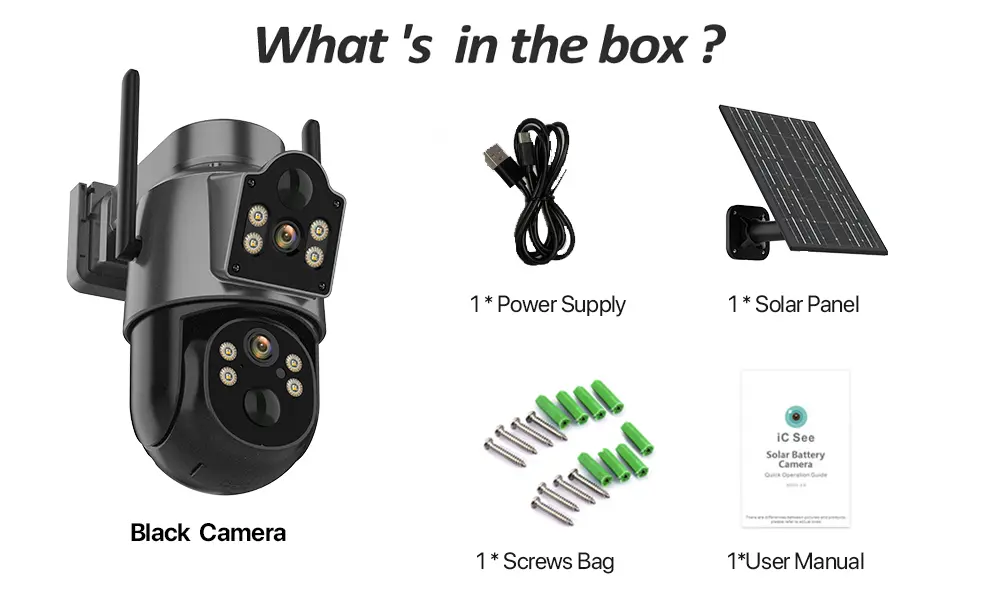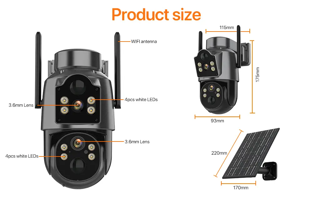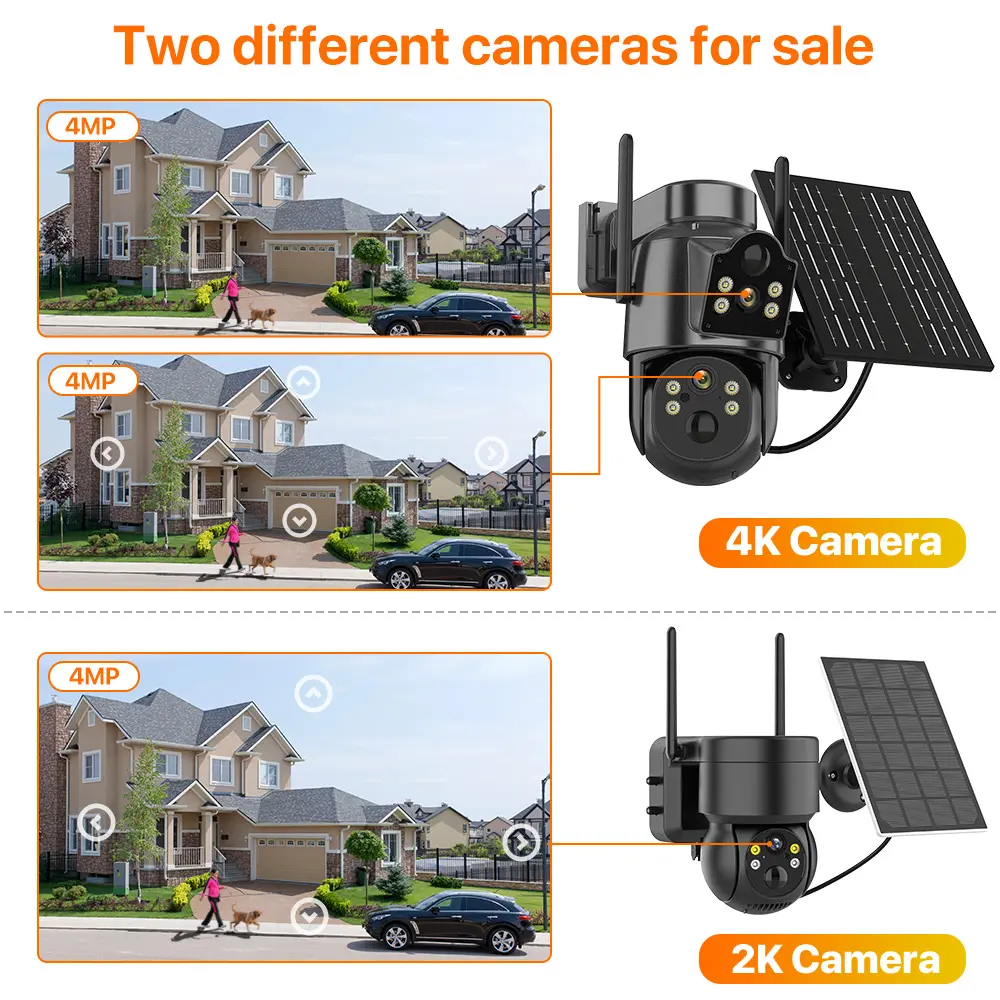 A dual lens dual screen solar camera, with two video screens visible in the app, one with a fixed lens and the other with a PTZ lens.