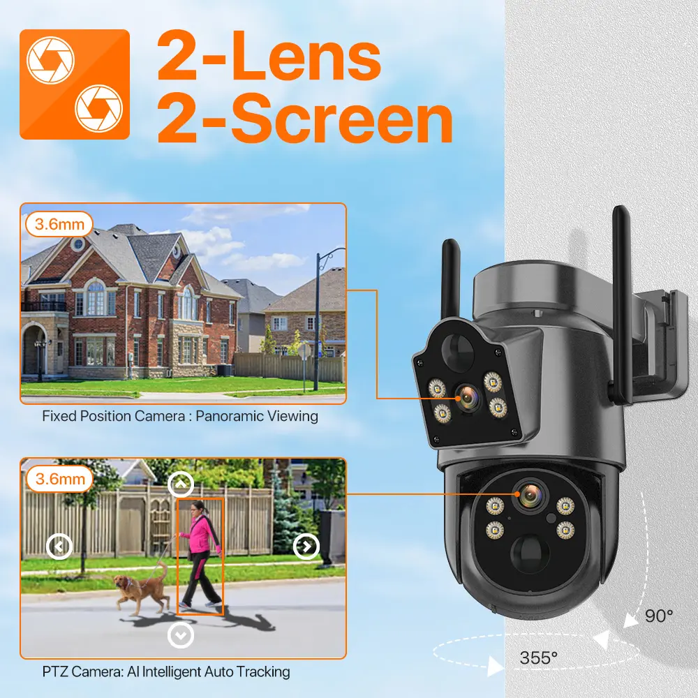 – Dual-Lens & Dual Screen.The first screen is PTZ camera, and the second screen is fixed position camera.