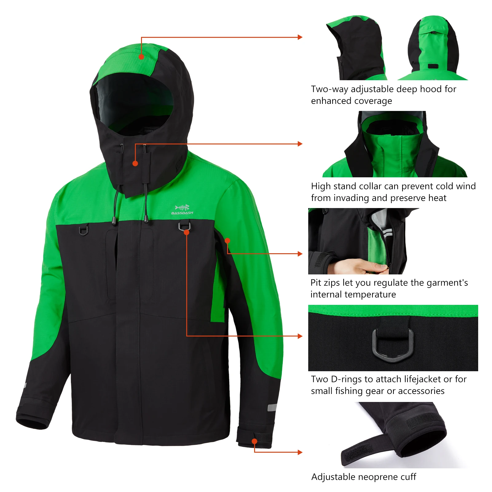 Features high stand collar and adjustable drawstring hem that can prevent cold wind from invading; Two-way adjustable deep hood for enhanced coverage, and the hood can be rolled up into the collar when not in use; Adjustable neoprene cuffs are soft and the stretch characteristics of the neoprene provide for a snug fit and ensure the water won’t enter through the cuffs.