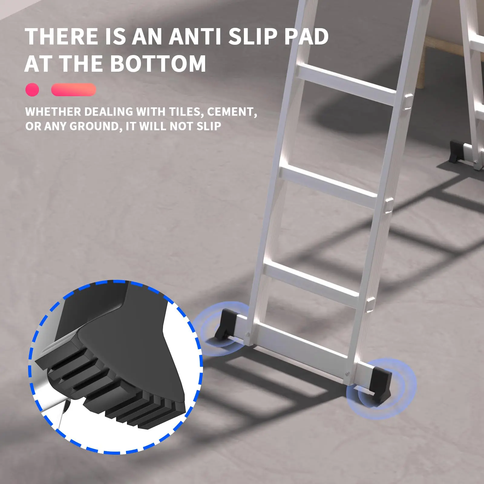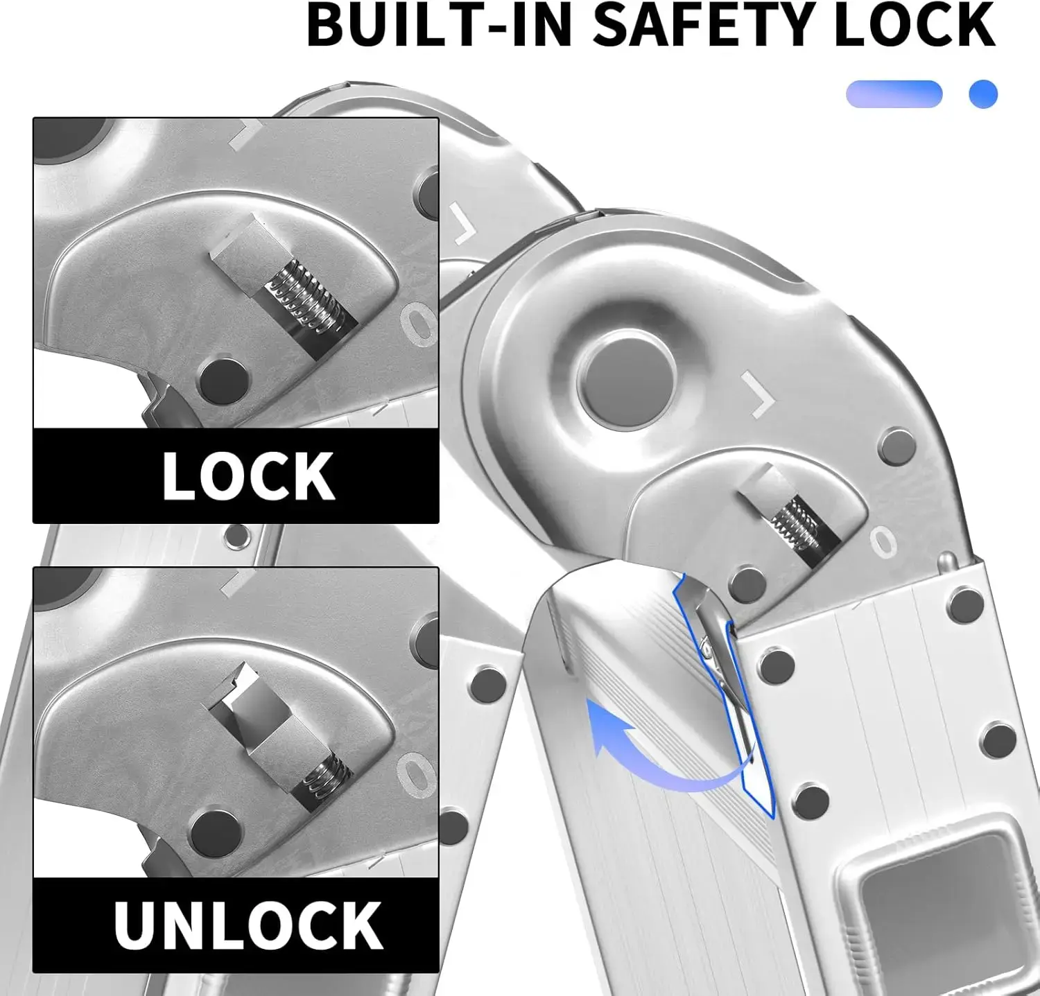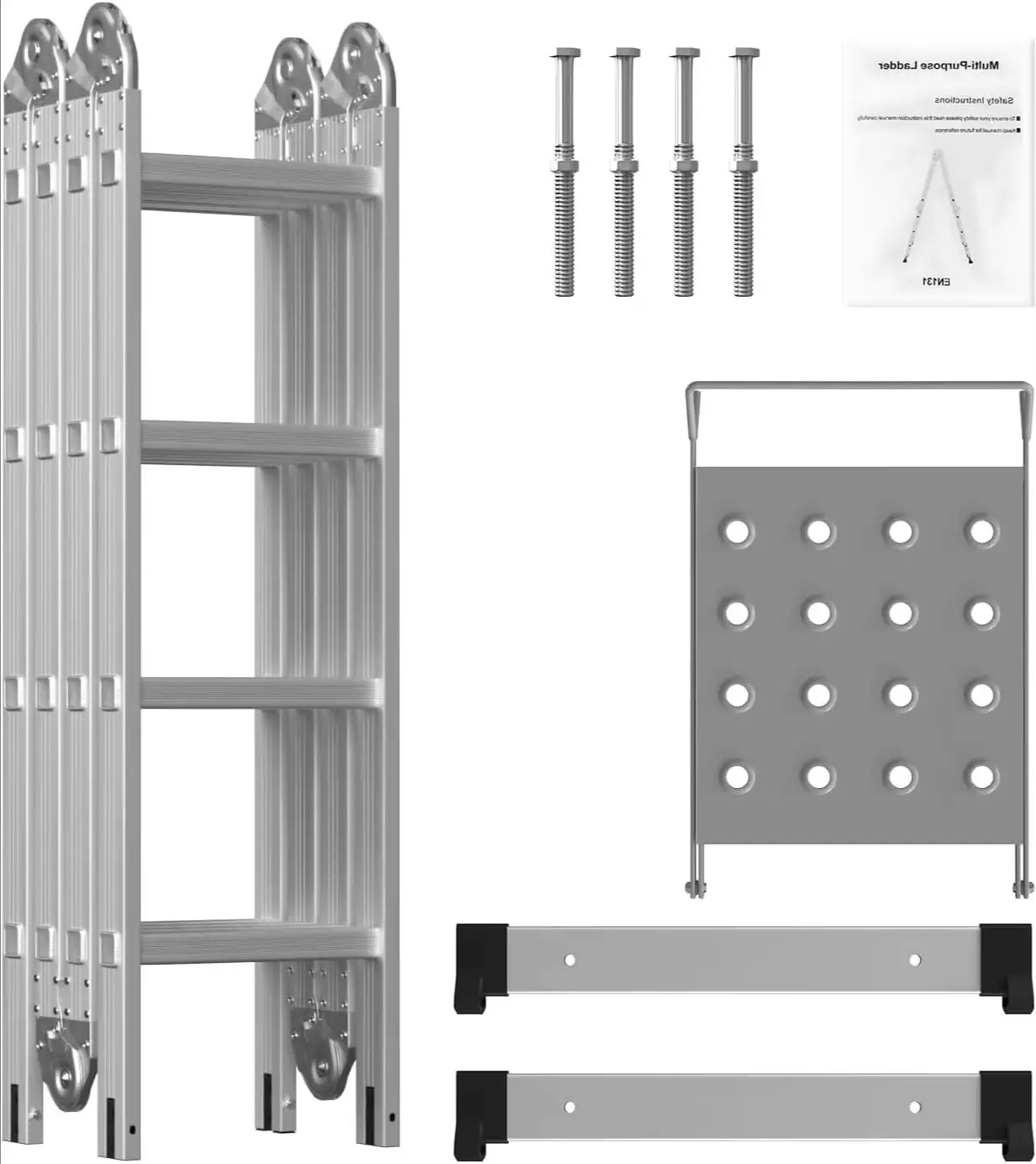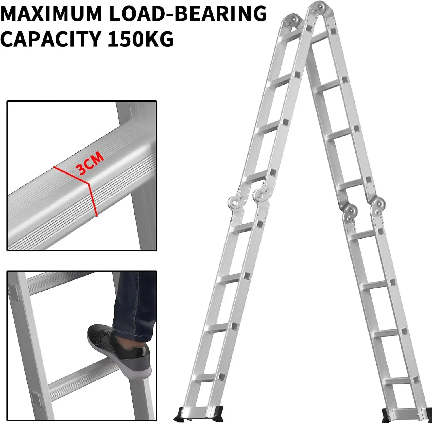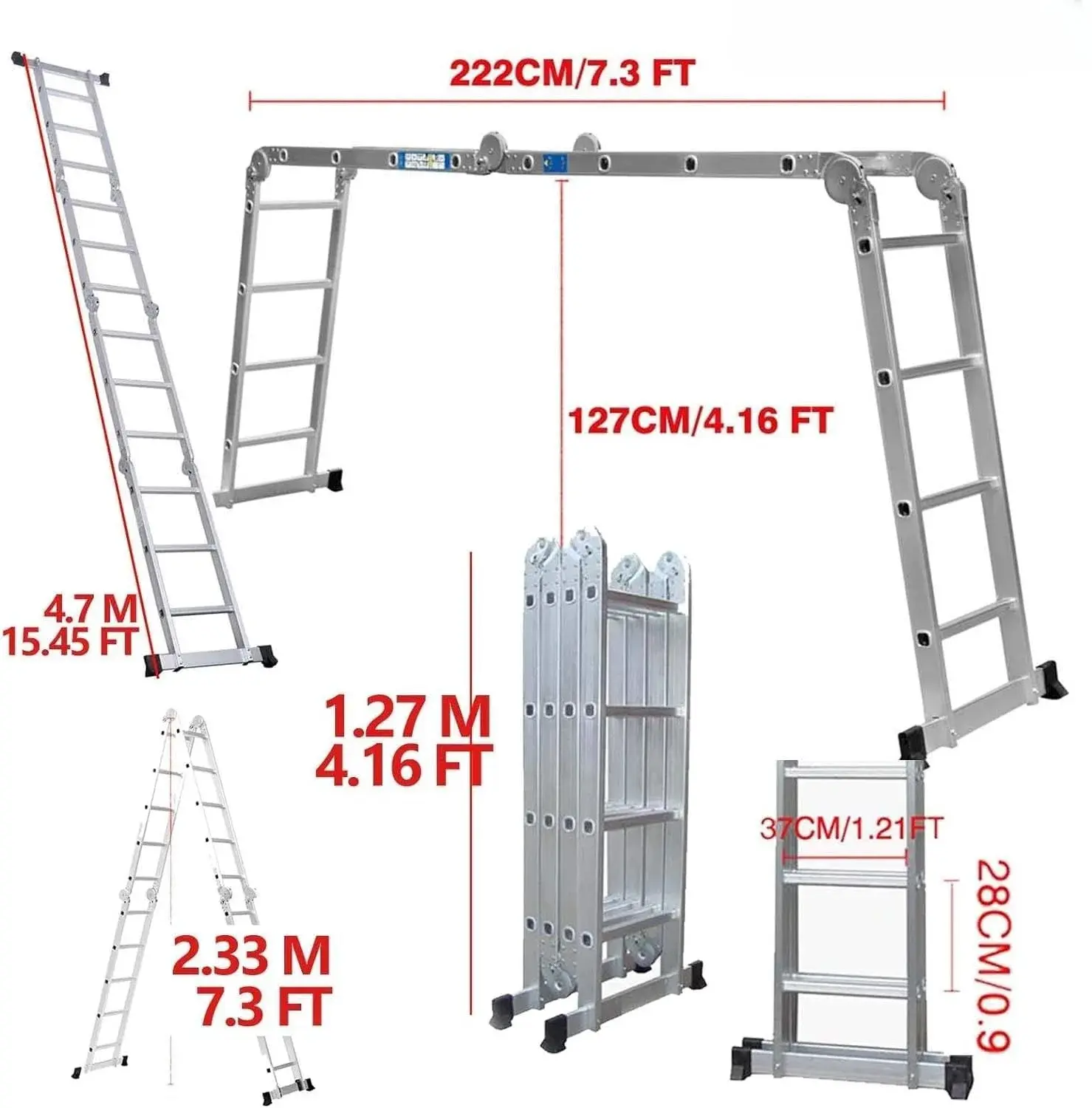 This 15.4 ft Aluminum Multipurpose ladder, perfect to work as a Loft Extension Ladder, step ladder, straight ladder and A-frame ladder It is sturdy and tough enough to withstand the even most demanding jobs. it’s ideal for both commercial use and do-it-yourself, like home building maintenance, window washing, exterior or interior Decorating, painting, etc. And the folding design allows both easy transport and space-saving storage. It can be your good helper.