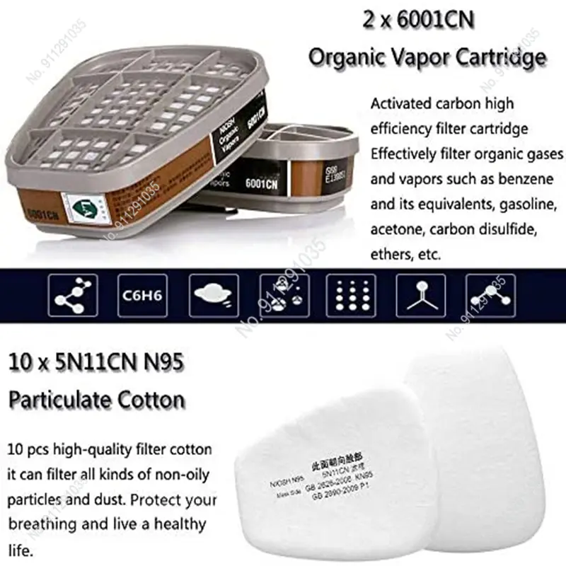 1 x 6800 Mask, 2 x 6001 Organic Gas Filters, 10 x 5N11 Cotton Filters, 2 x Filter Covers,2 x 2091 filter cotton