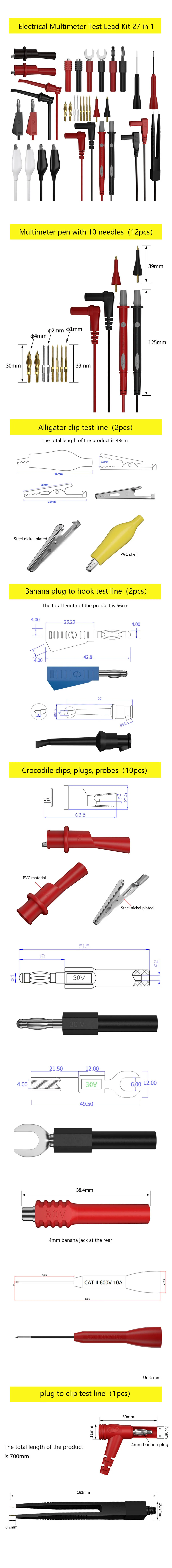 Electrical Multimeter Test Lead Kit, Alligator Clip, Test Probe, Test Hook, Gel, Plug, DIY Tool, 27 in 1