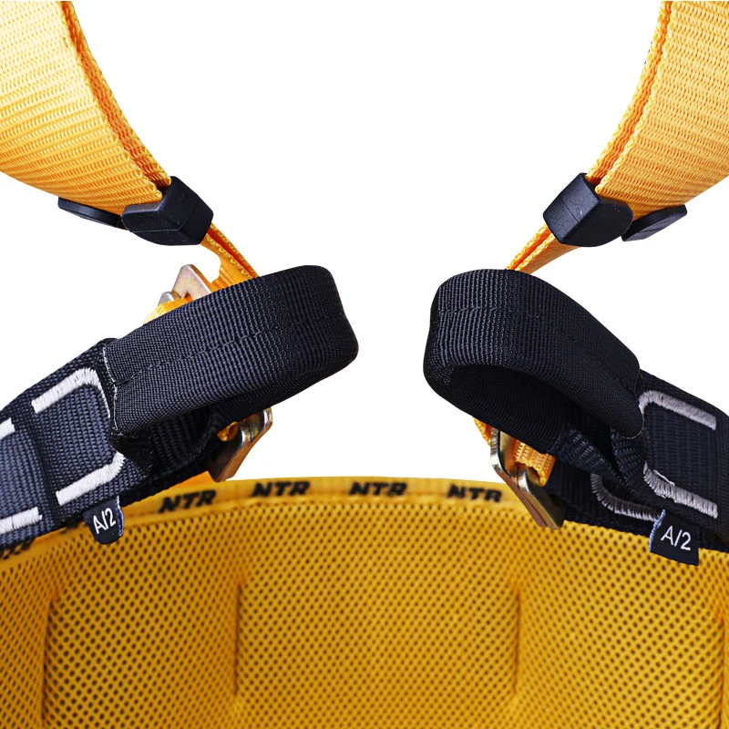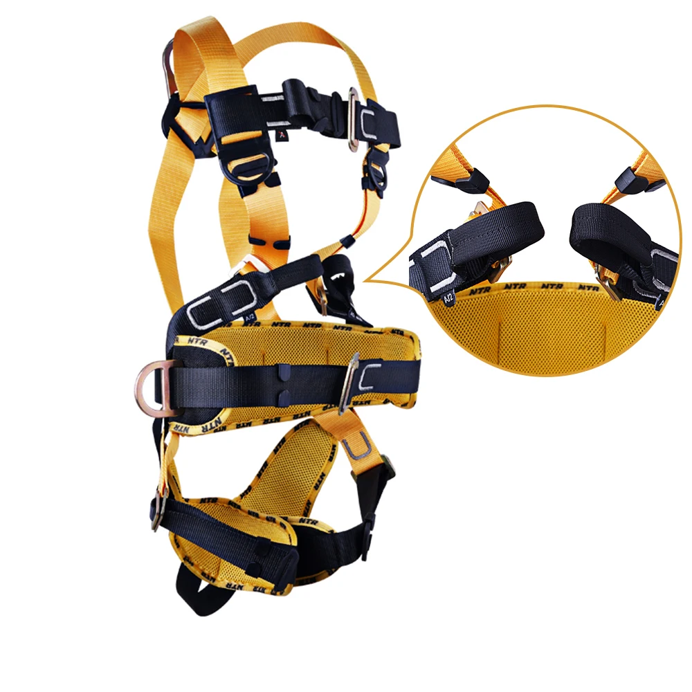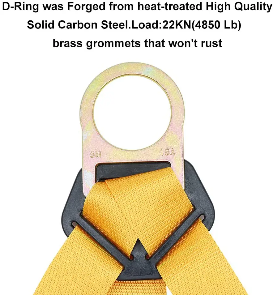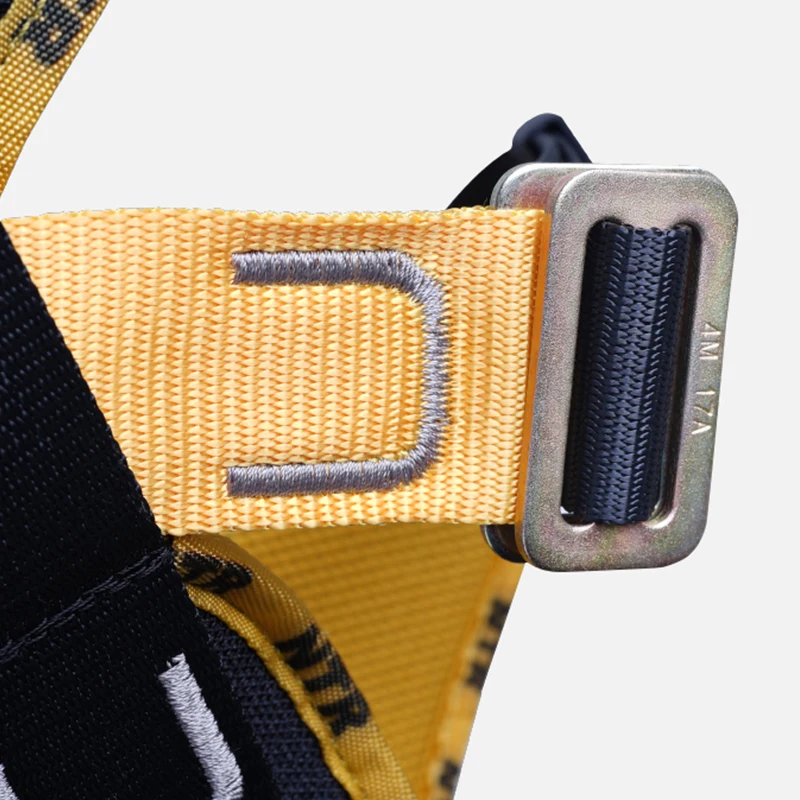 (1) Material: high strength polyester,steel (2) Waist belt: 80-140cm (adjustable) (3) Thigh loop: 54-80cm (adjustable) (4) Shoulder width: 45cm (5) Height: 95cm (6) Color(s): yellow with black (7) Standard(s): EN361:2002,EN358:2018 (8) Function(s): general fall protection,work station position (9) Attachement point: 2 lateral D-rings for work positioning,1×dorsal D-ring,2×sternal gear D-ring,1×sternal D-ring for ladder climbing (10) Application(s): construction,power industry,building rescue,limited space work,tower climbing and other height work. (11) Work load: 140KG