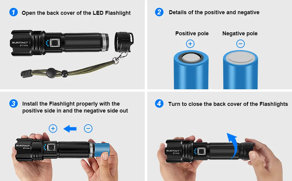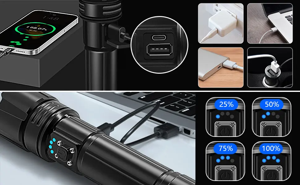 【USB recargable e indicador de energía】: Estas linternas recargables pueden proporcionar hasta 12 horas de tiempo de funcionamiento, con protección de sobrecarga mejorada, se pueden cargar con un cable USB (incluido). La luz del flash dejará de cargarse cuando esté completamente cargada, por lo que no tenemos que preocuparnos por la seguridad cuando olvidemos que la linterna está cargando. También puede cargar el teléfono en caso de emergencia. El indicador de potencia sobre la linterna le ayuda a comprender claramente la potencia de la linterna (25%, 50%, 75%, 100%).