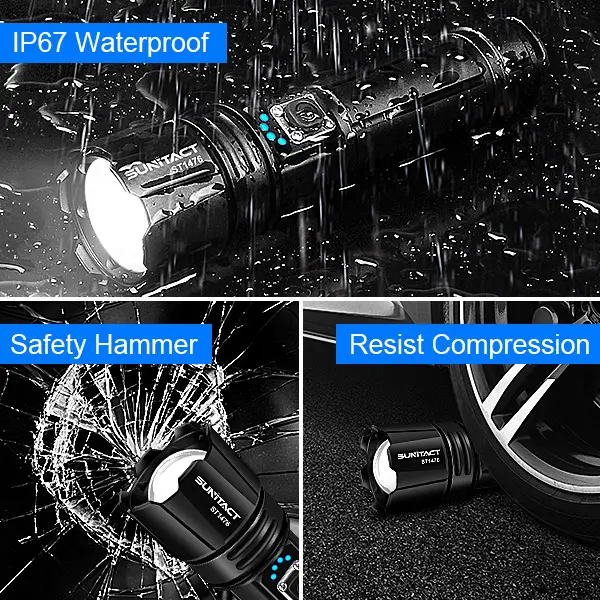 【IP67 IMPERMEABLE Y PRÁCTICAMENTE INDESTRUCTIBLE】: La linterna LED impermeable KS Home IP67 está diseñada para un manejo brusco. El cuerpo de aleación de aluminio de grado aeroespacial de alta calidad protege la linterna LED recargable del óxido o los arañazos. Después de las pruebas que incluyeron la congelación, la inmersión bajo el agua y el atropello con un camión de tamaño completo y una caída de 10 pies, ¡todavía funciona! Esta linterna de alta potencia es lo suficientemente duradera en cualquier situación, especialmente en situaciones de lluvia, nieve o emergencia.