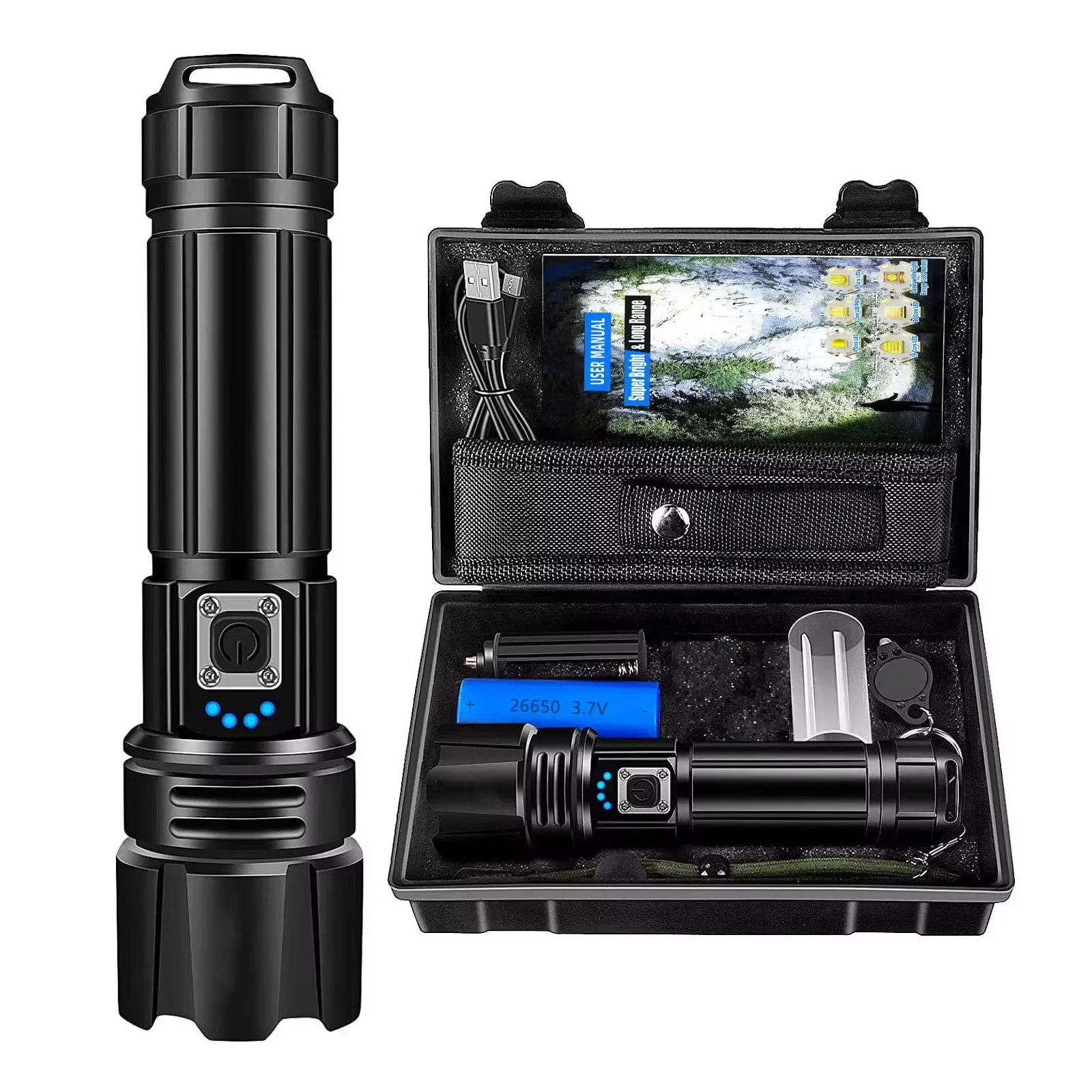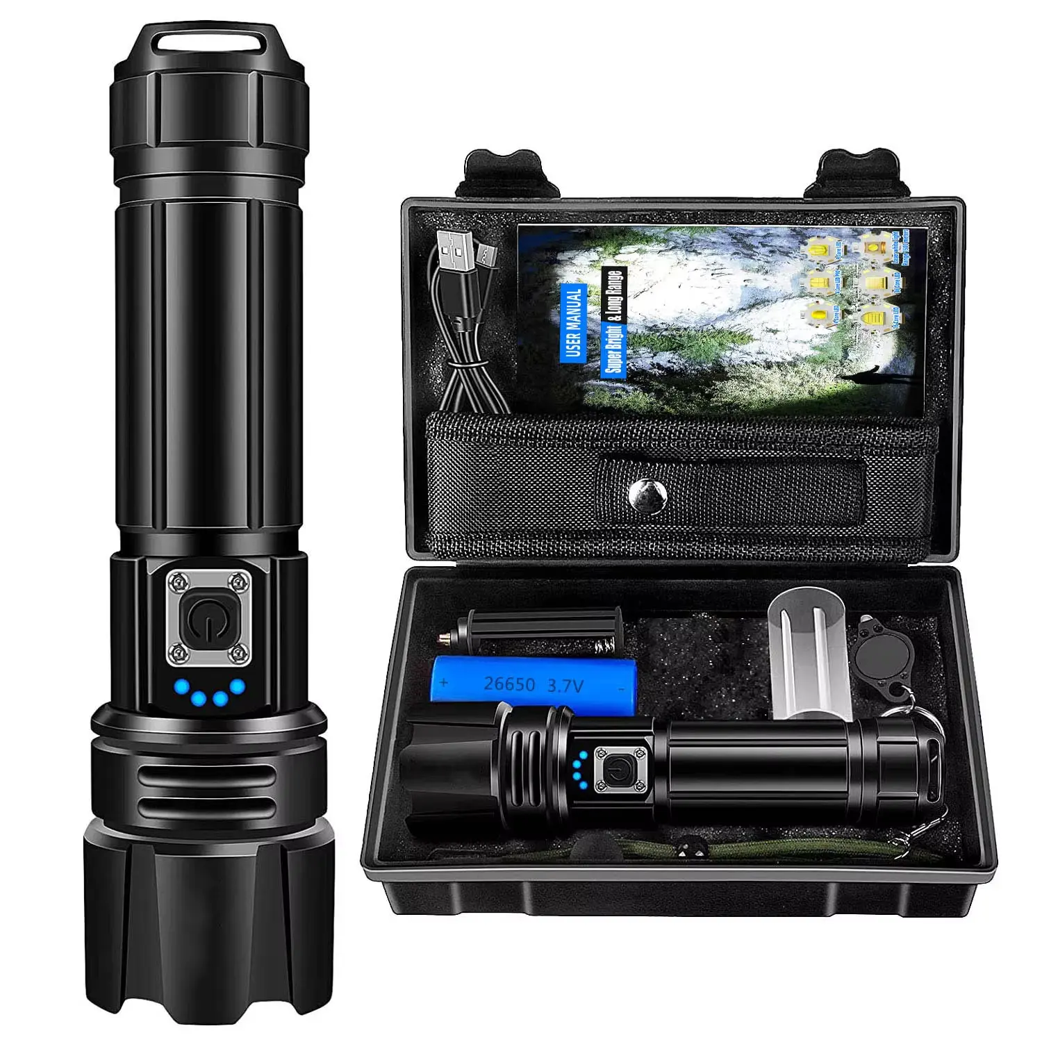 【USB recargable e indicador de energía】: Estas linternas recargables pueden proporcionar hasta 12 horas de tiempo de funcionamiento, con protección de sobrecarga mejorada, se pueden cargar con un cable USB (incluido). La luz del flash dejará de cargarse cuando esté completamente cargada, por lo que no tenemos que preocuparnos por la seguridad cuando olvidemos que la linterna está cargando. También puede cargar el teléfono en caso de emergencia. El indicador de potencia sobre la linterna le ayuda a comprender claramente la potencia de la linterna (25%, 50%, 75%, 100%).