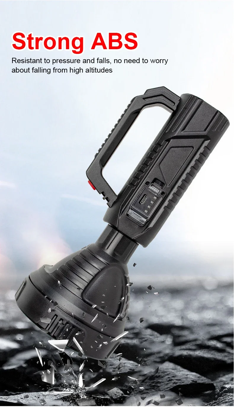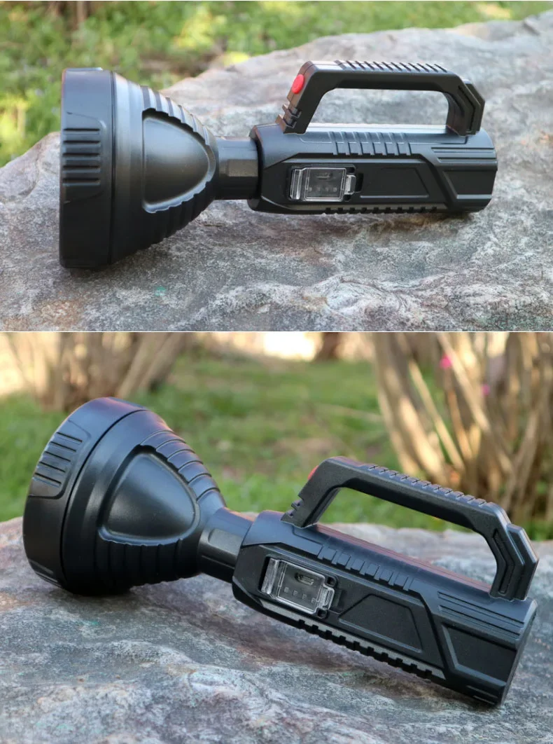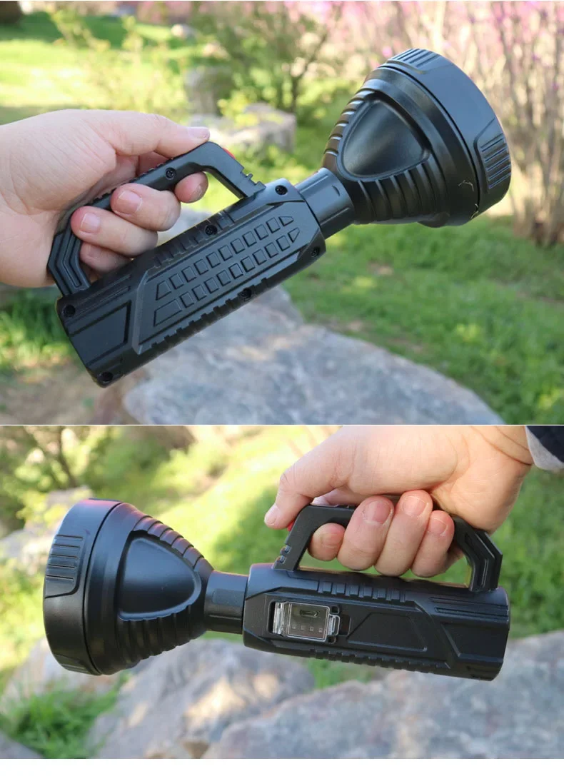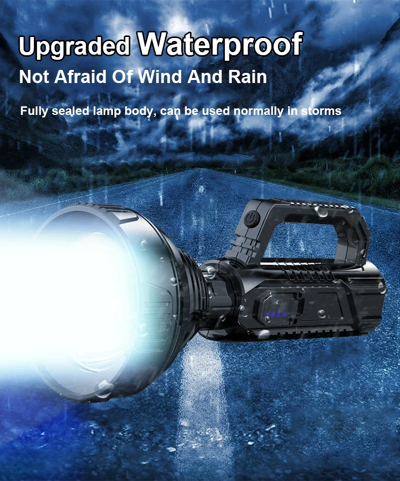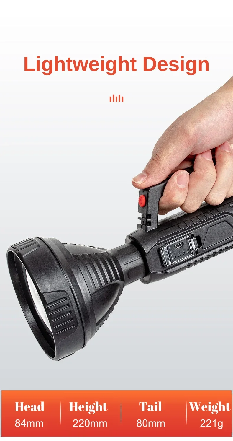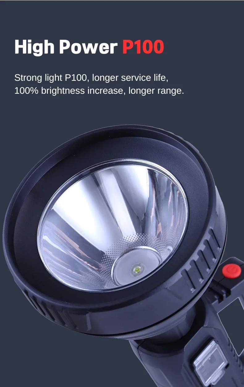 The newly upgraded P100 high-power searchlight has a larger and deeper lamp cup. Compared with the previous generation P50 wick, the brightness is increased by 100%, the long-range is increased, 1500+M high-brightness lighting, wider and farther lighting, whether you are using it at home , emergency recruitment or outdoor use, are very suitable. Large size but light weight, easy to use, it is a wise choice for adults and children; built-in 18650 lithium battery, no need to replace the battery frequently, the internal circuit is more stable, can provide long-term lighting for 4-12 hours; the waterproof performance is also improved upgraded, high-density structure, fully sealed lamp body, waterproof and dustproof, can be used normally even in rainy days.