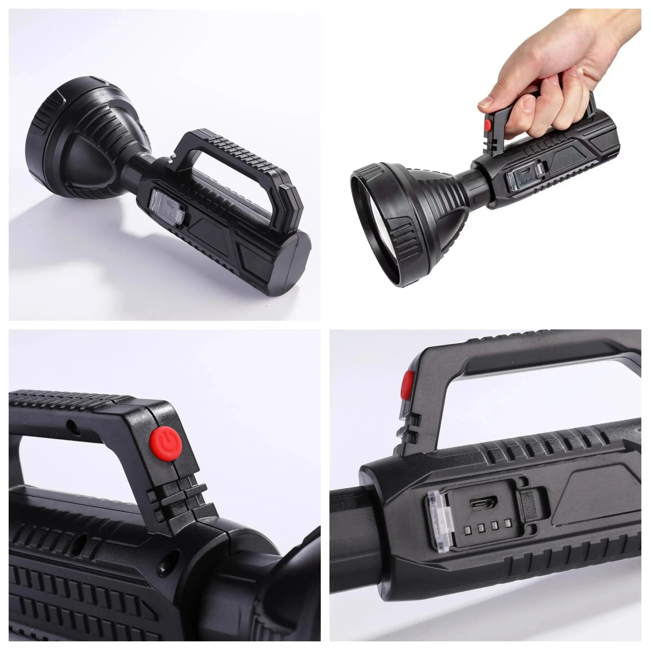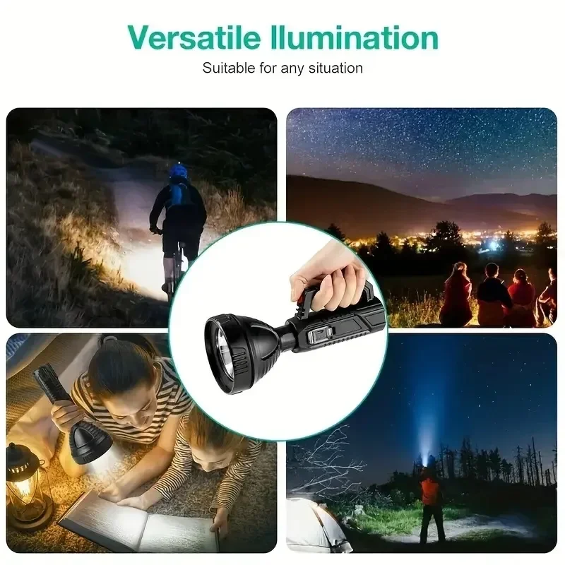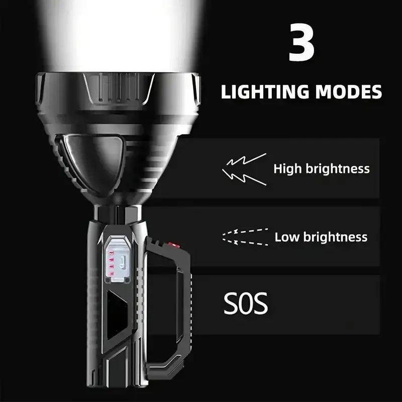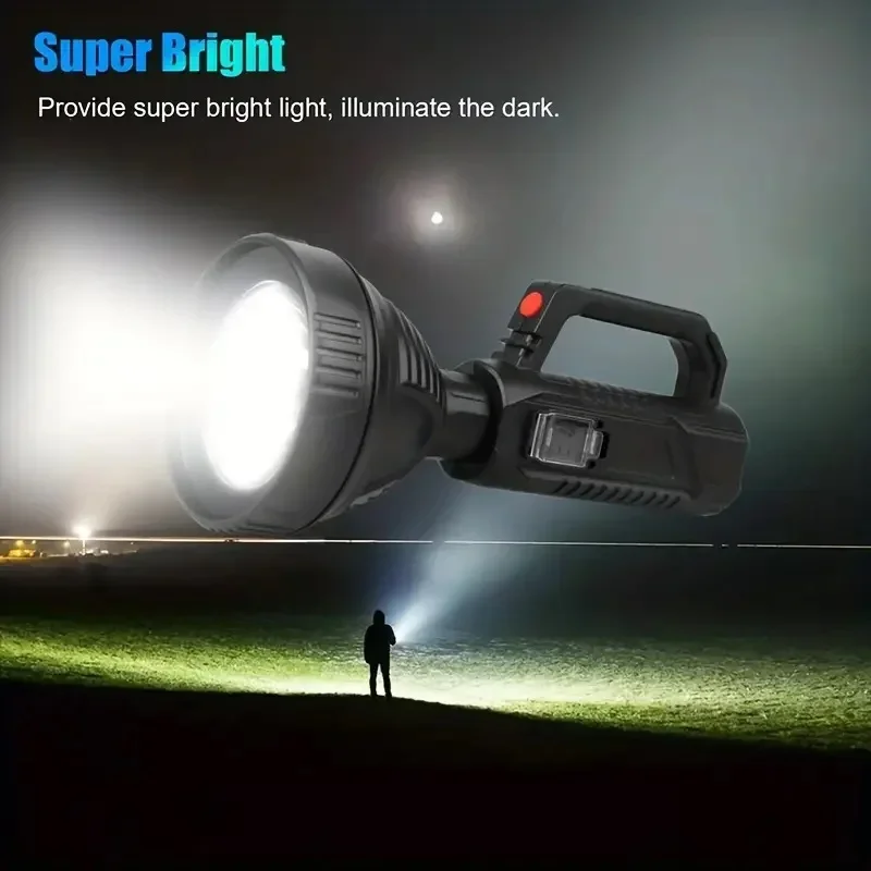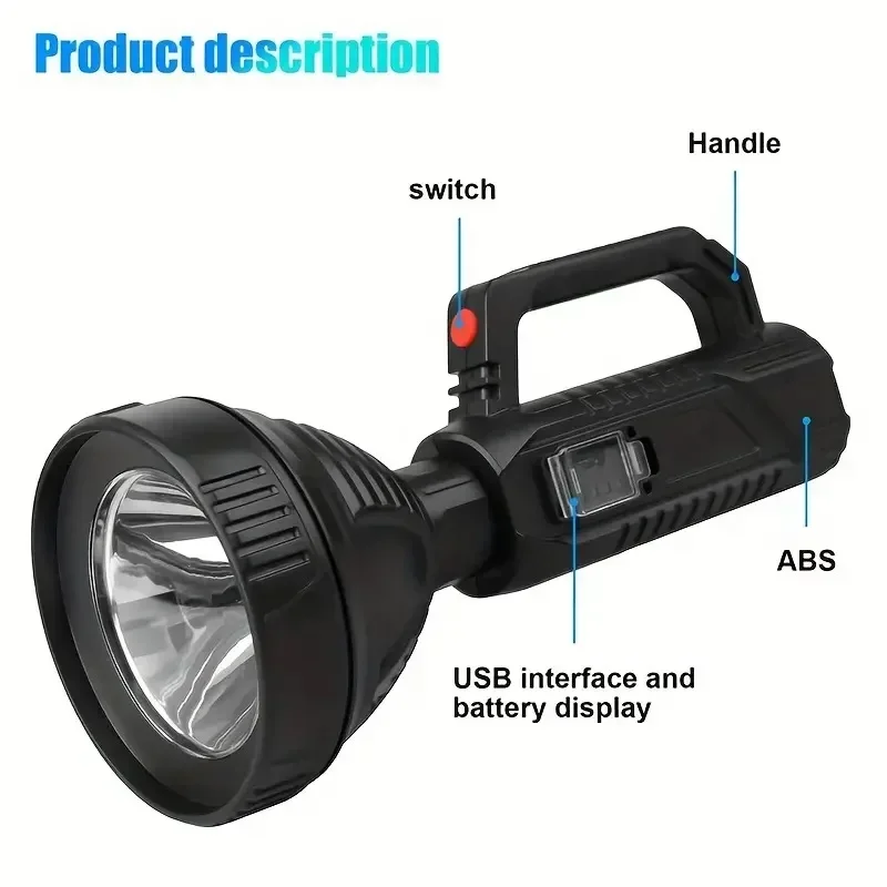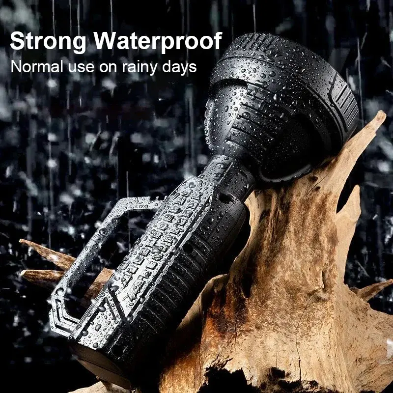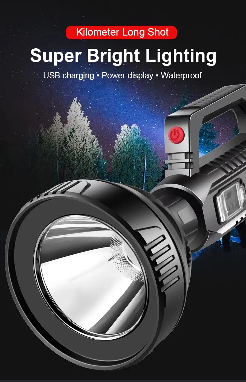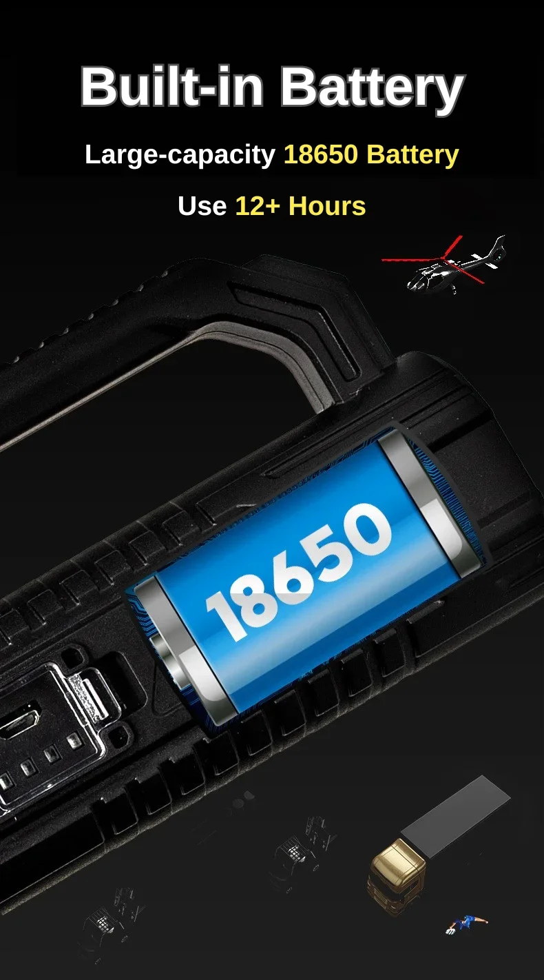 The newly upgraded P100 high-power searchlight has a larger and deeper lamp cup. Compared with the previous generation P50 wick, the brightness is increased by 100%, the long-range is increased, 1500+M high-brightness lighting, wider and farther lighting, whether you are using it at home , emergency recruitment or outdoor use, are very suitable. Large size but light weight, easy to use, it is a wise choice for adults and children; built-in 18650 lithium battery, no need to replace the battery frequently, the internal circuit is more stable, can provide long-term lighting for 4-12 hours; the waterproof performance is also improved upgraded, high-density structure, fully sealed lamp body, waterproof and dustproof, can be used normally even in rainy days.