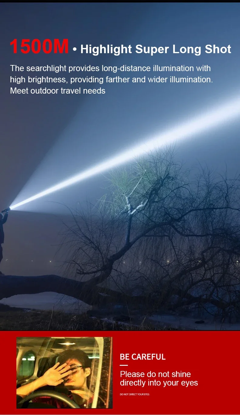 Hightlight 1500M super long shot, provide farther and wider illumination, meet outdoor travel needs.