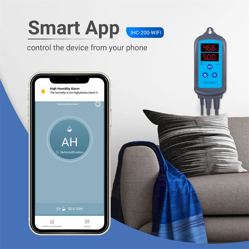 ♦Remote Control: Connect the IHC-200Wi-Fi humidity controller to 2.4GHz Wi-Fi, then you can monitor or adjust the humidity on your phone through the app at any time anywhere.