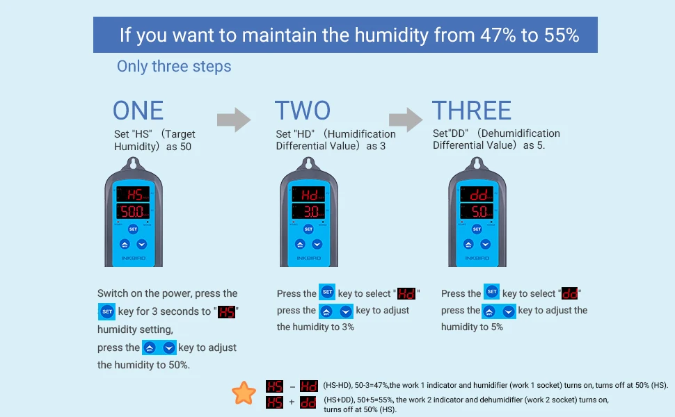 ♦Plug-n-Play: No complicated installation required. Display the set humidity value and the measured humidity value at the same timewith 2 screens. Supporthumidity calibration and dehumidification control delay protection.