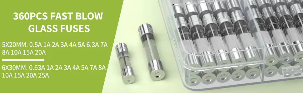 High quality glass fuseNickel-plated copper cap at both ends, transparent glass tube in the middle. Welding heat resistant, safe and firm.  | Package IncludesThis Fast Blow Glass Fuses Assortment Kit includes 6x30mm/12 kinds: 0.63A 1A 2A 3A 4A 5A 7A 8A 10A 15A 20A 25A, 5x20mm/12 kinds: 0.5A 1A 2A 3A 4A 5A 6.3A 7A 8A 10A 15A 20A, total 360pcs.  | Packaging boxEach glass fuse is organized and packaged in a transparent plastic box, which will not be damaged during transportation and is easier to store and carry.  |