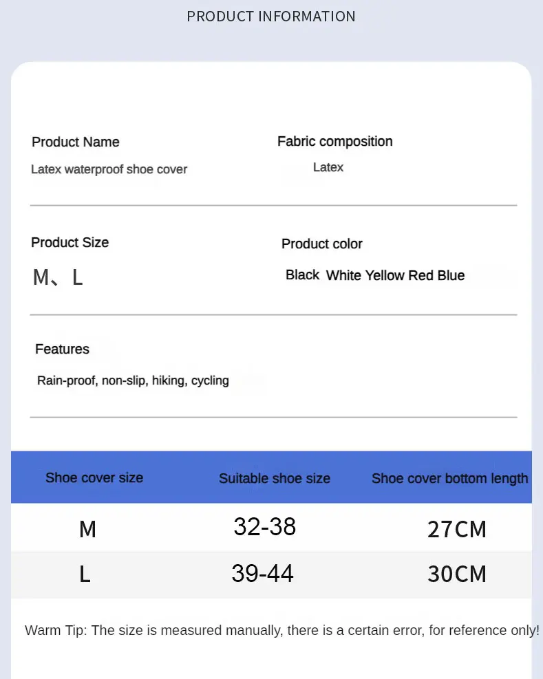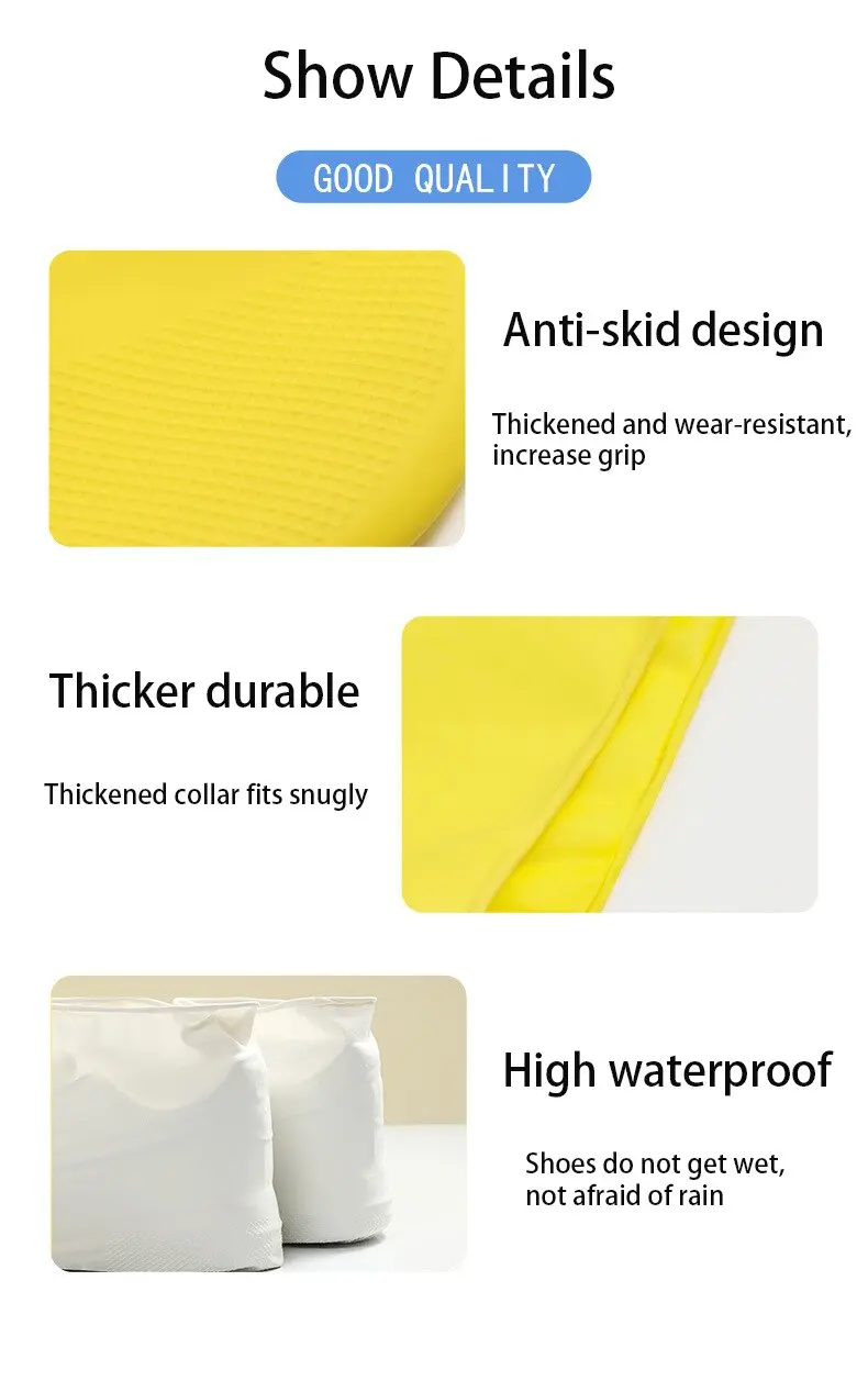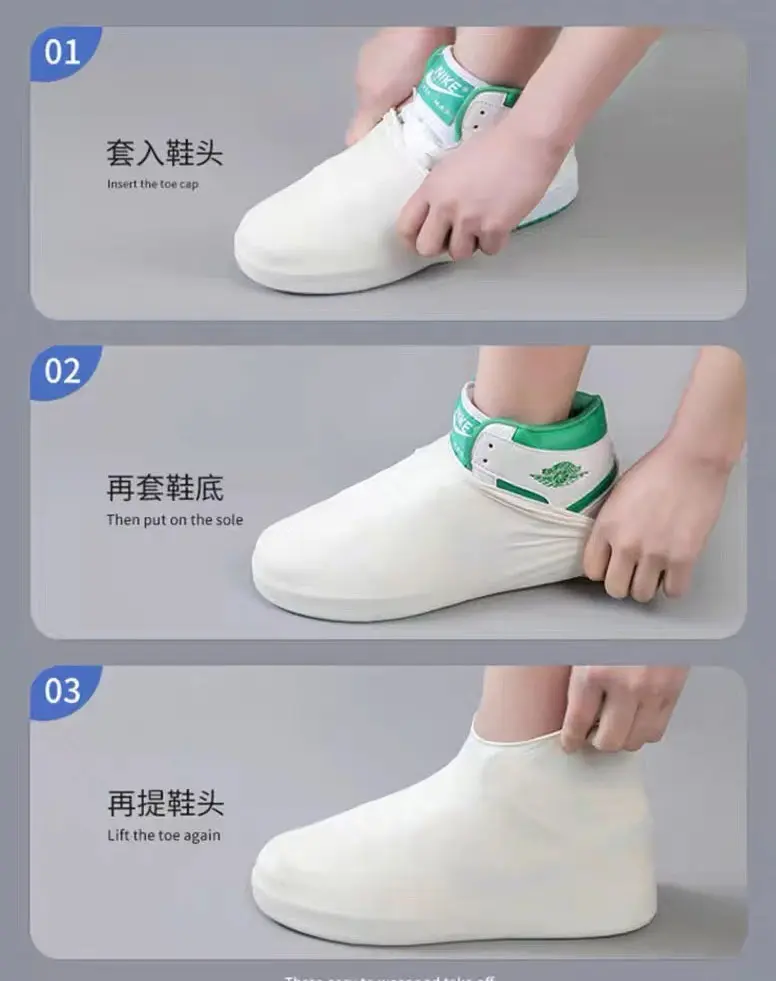 2, Ultra elastic silicone shoe cover stretches freely, it is easy to wear but not easy to fall, when you go through it has good elasticity. It also fits all kinds of shoes.