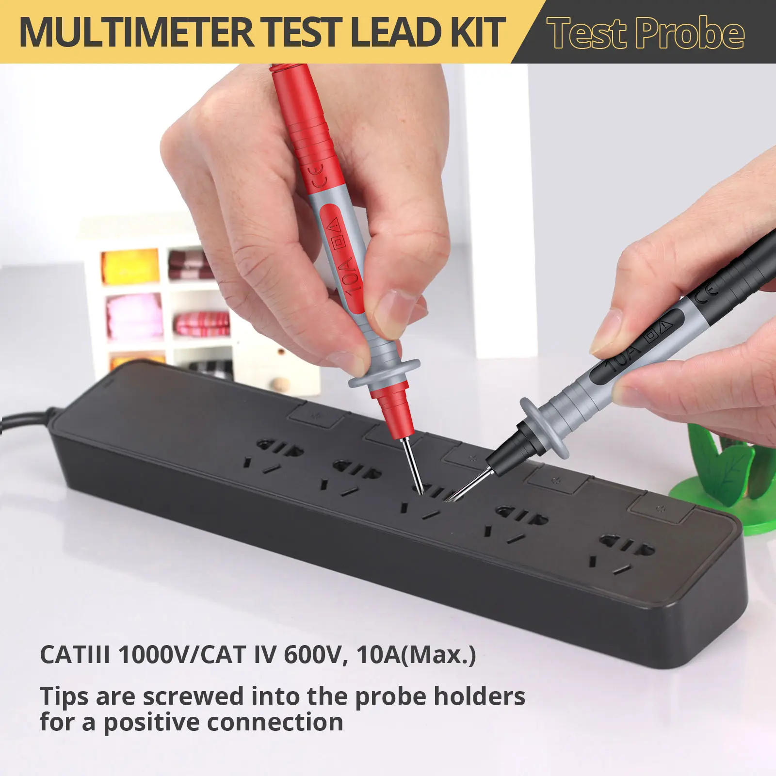 Test Probe: Designed to improve steadiness in slippery hands. Rubber overmolded surfaces give the user a comfortable, reliable grip on the accessory so they can focus on making an accurate measurement.Come with extra 8pcs interchangeable probe tips(4pcs nickel-plated copper and 4pcs gold-plated copper — small enough to access the tightest of SMD equipment.).