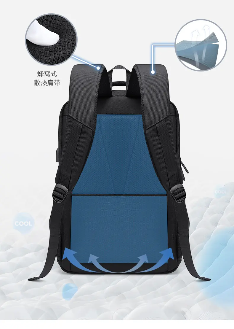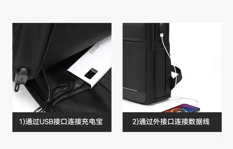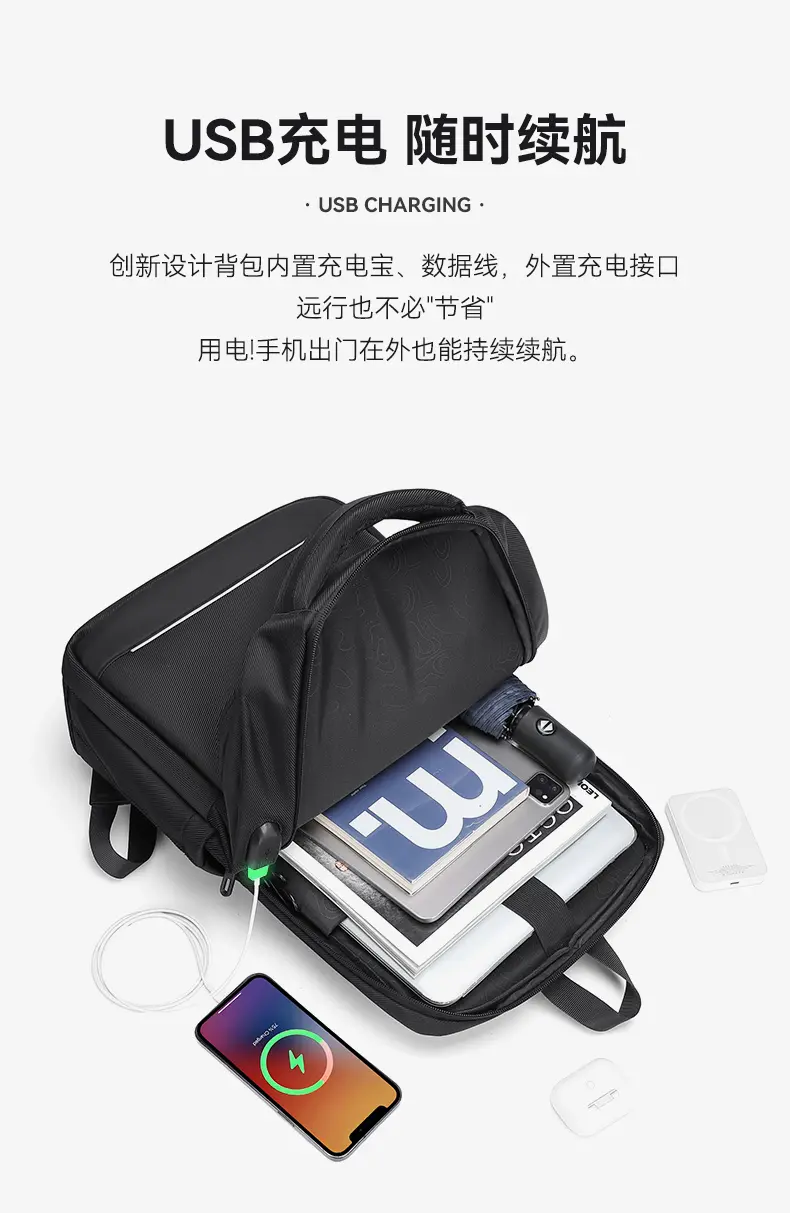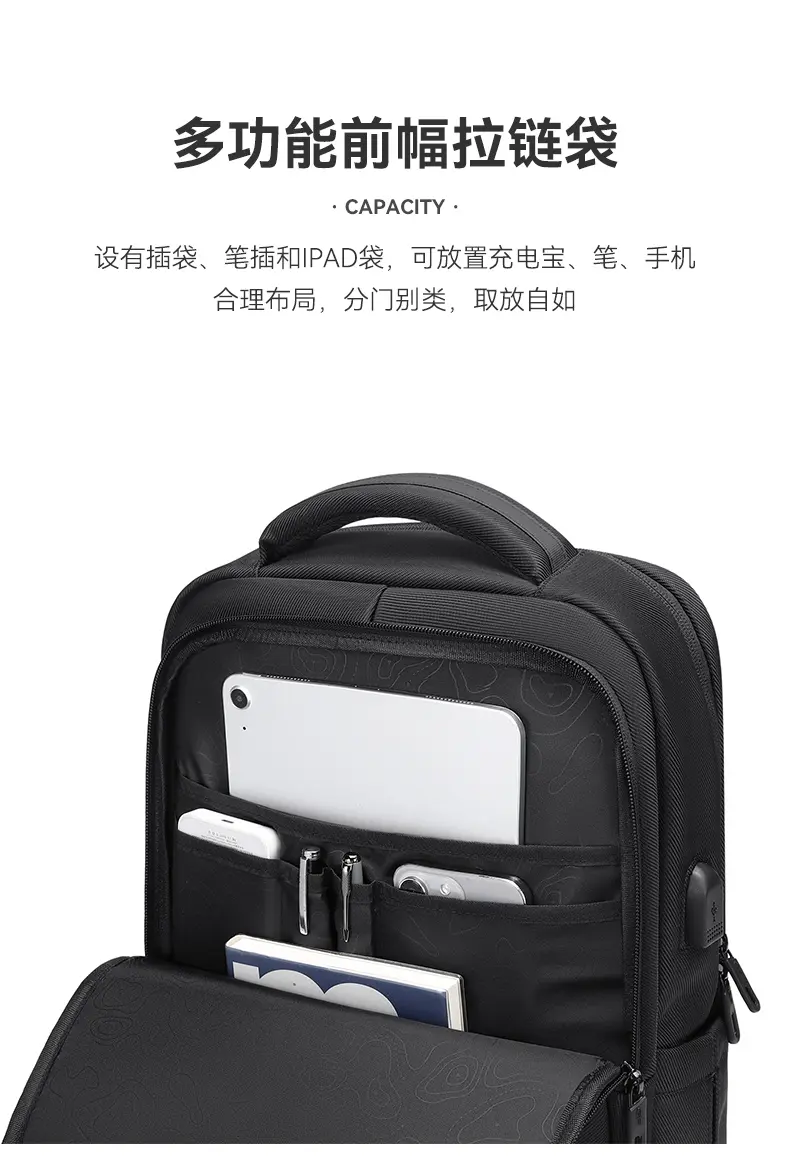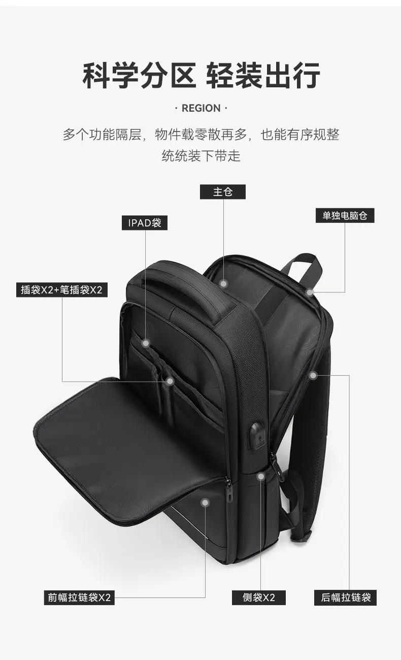 External: 2 front zipper pockets, 2 side pockets, 1 rear zipper strap, 1 rear zipper pocket, 1 USB port.