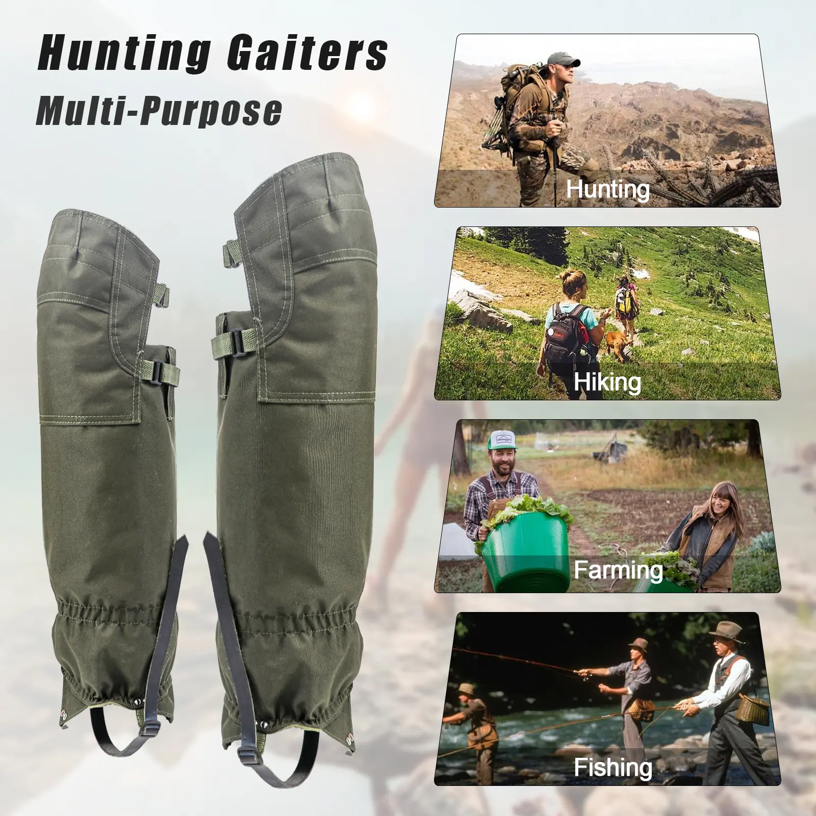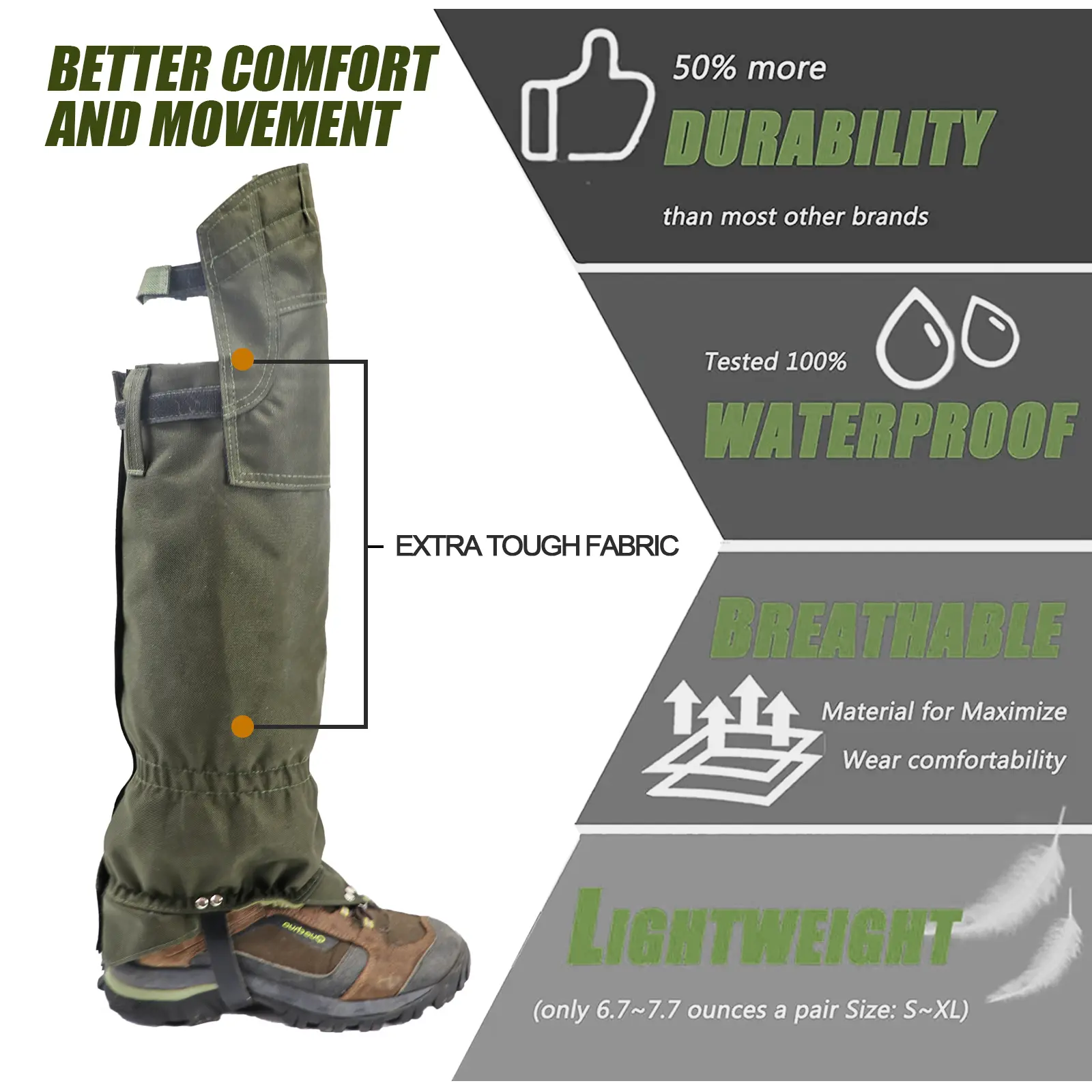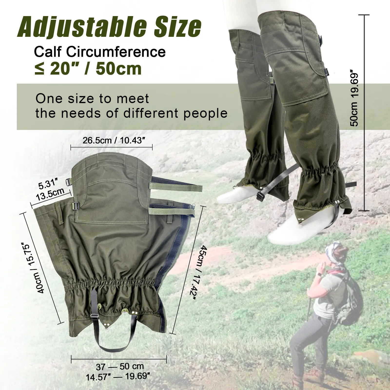 【Multi-functional】: The waterproof high gaiters can be used for various outdoor activities, including snow, desert, rain, jungle, hiking, hunting, running, walking, skiing, backpacking, and more. With their versatility and durability, these gaiters are an essential accessory for any outdoor enthusiast.