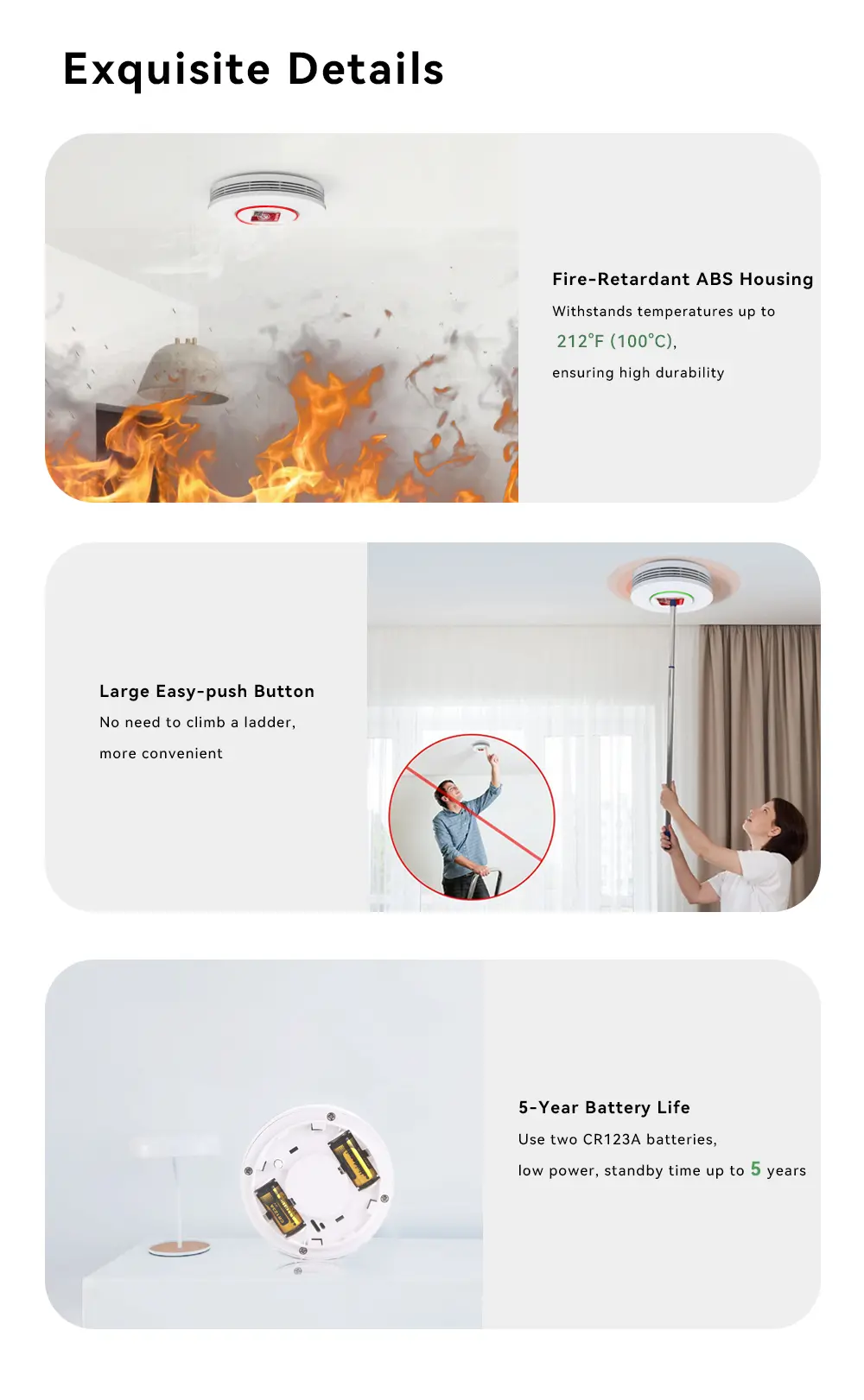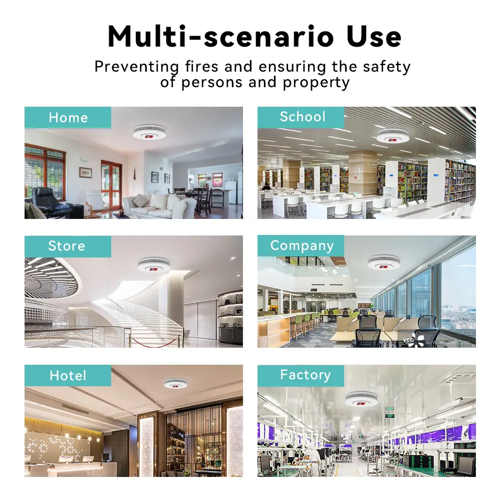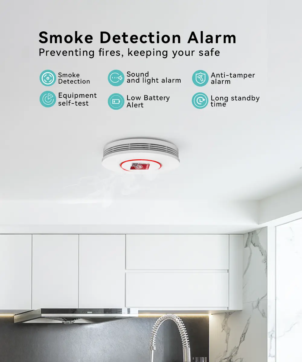 Smoke and temperature sensing integrated design, when the sensor detects high smoke concentration or high indoor temperature (>70°), it will alarm in time, which is a necessity for indoor fire prevention.