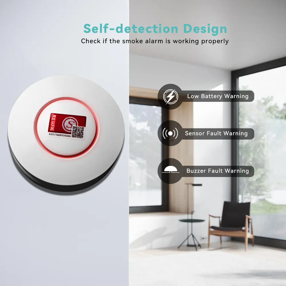 Smoke sensor enables self-testing, low battery warning, sensor fault warning, buzzer fault warning. You can also press the self-inspection button to perform periodic self-inspection to ensure the normal operation of the alarm.