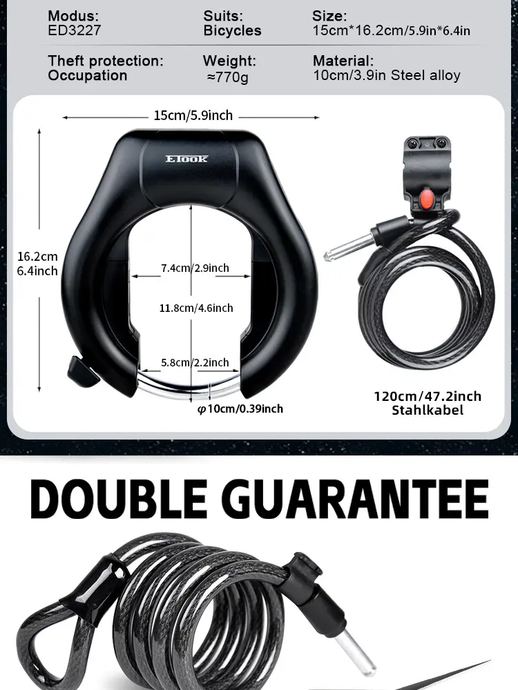 Specifications: Material: High-strength Steel Type: Portable Hardware Road Bike Lock Category: Bicycle Lock Design and Style: Sleek, Compact, and Durable Usage and Purpose: Secure Bicycles in Various Environments Performance and Property: High Safety and Resistance to Cutting Features: |Heavy Duty Cable Lock|U Lock Vs Cable Lock|Bike Lock Cable| **Unmatched Security and Durability** The ETOOK Steel Pipe Lock is a testament to the fusion of security and portability. Crafted from robust steel, this bike lock is designed to withstand the rigors of daily use and the unpredictable elements. Its sleek, compact design ensures that it can be easily transported without adding unnecessary bulk to your cycling gear. The lock's high safety rating is a result of its unbreakable construction, making it a reliable choice for protecting your bicycle against theft. **Versatile and Adaptable** Whether you're a casual cyclist or a professional racer, the ETOOK Steel Pipe Lock is versatile enough to meet your security needs. Its portable nature makes it ideal for securing bicycles in urban environments, parks, or at home. The lock's design is not only functional but also aesthetically pleasing, blending seamlessly with your bike's style. Its ease of use and quick locking mechanism ensure that you can secure your bike swiftly, allowing you to focus on your ride without worry. **Peace of Mind for Cyclists** With the ETOOK Steel Pipe Lock, cyclists can enjoy peace of mind knowing that their bicycles are safeguarded against theft. The lock's resistance to cutting makes it a formidable barrier against potential thieves. Its durability is not just about withstanding physical attacks; it also stands up to the test of time, ensuring that your investment in this lock is a long-term solution for your bicycle security needs. Whether you're locking up your electric bike or a mountain bike, this lock is designed to provide the highest level of security and reliability.