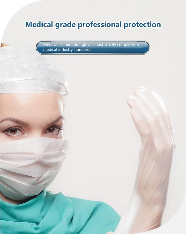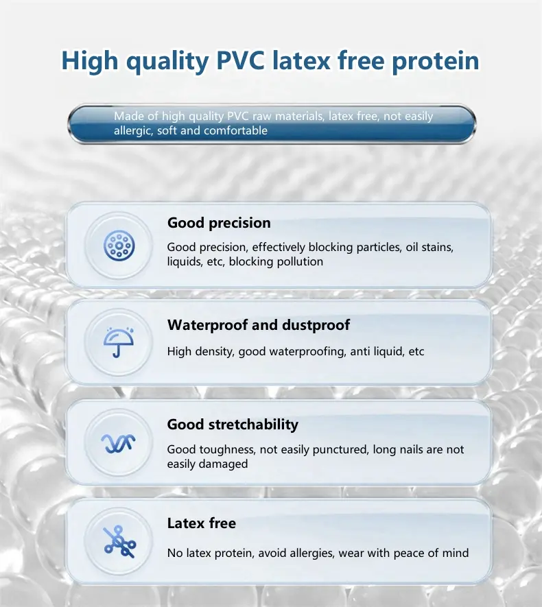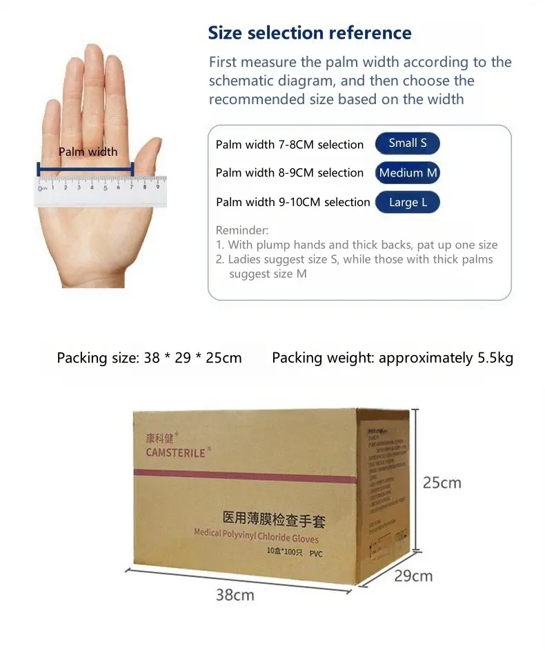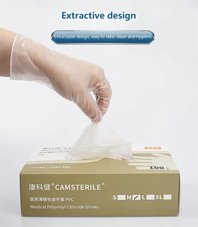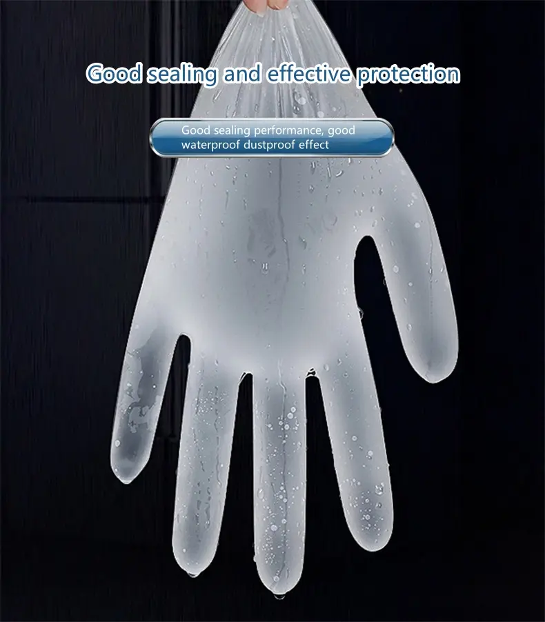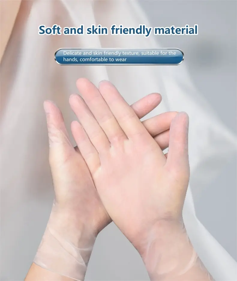 Specifications: Material Quality: High-grade Polyvinyl Chloride (PVC) Design: Palm pitted surface and curled edge design at the cuffs for enhanced protection Size Options: Available in S, M, and L to fit various hand sizes Color: Transparent white for easy visibility Length: 9 inches (approximately 23CM) Quantity: Each pack contains 100 pieces, ensuring ample supply for multiple uses Features: **Unmatched Protection and Comfort** The Wholesale 9-inch food grade PVC examination gloves are the epitome of safety and protection. Crafted from high-quality PVC, these gloves offer exceptional flexibility and resistance to tensile cracking, making them a reliable choice for a variety of tasks. Whether you're in the food industry, working in a laboratory, or involved in epidemic isolation, these gloves provide a barrier against contamination, ensuring the safety of both the wearer and the products they handle. **Versatile and User-Friendly Design** The gloves' design is thoughtfully considered to enhance user experience. The pitted surface design of the palm and the rolled edge design at the cuffs not only enhance the aesthetic appeal of the gloves but also provide a secure fit, minimizing the risk of contamination. The transparent white color ensures better protection for the wearer, making tasks more precise and efficient. The 9-inch length offers full coverage, providing more comprehensive protection for the wearer, the pull-out design makes glove extraction more convenient, ensuring a clean and hygienic working environment. **Perfect for a Range of Scenarios** These disposable gloves are not only appropriate for protection but also designed to improve work efficiency. The soft and comfortable fit makes them suitable for extended use, while the good sealing and waterproof properties ensure that tasks are completed without compromising on safety. The versatility of these gloves extends to a variety of scenarios, from food preparation to beauty and facial care, making them an indispensable addition to any safety gear collection. With 100 pieces per pack, you can rest assured that you have an ample supply for all your safety needs.