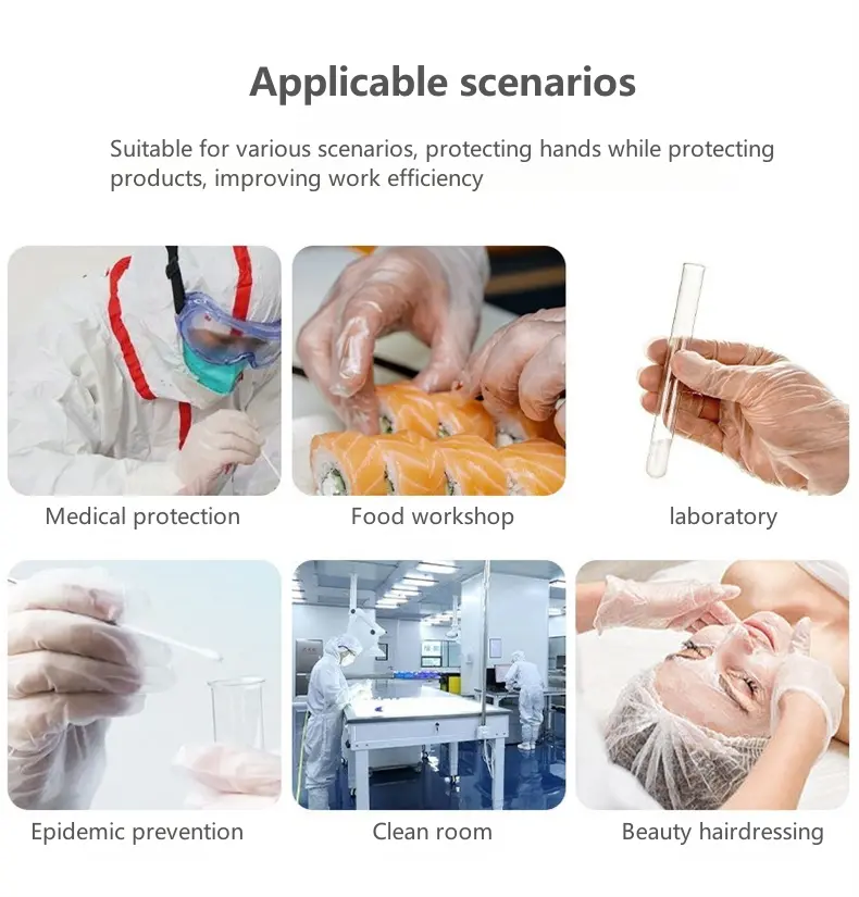 Suitable for scenarios such as protection, food workshops, epidemic isolation, laboratory work, beauty and facial care, while protecting products and hands, improving work efficiency.