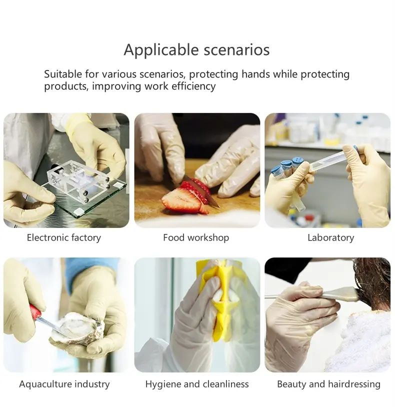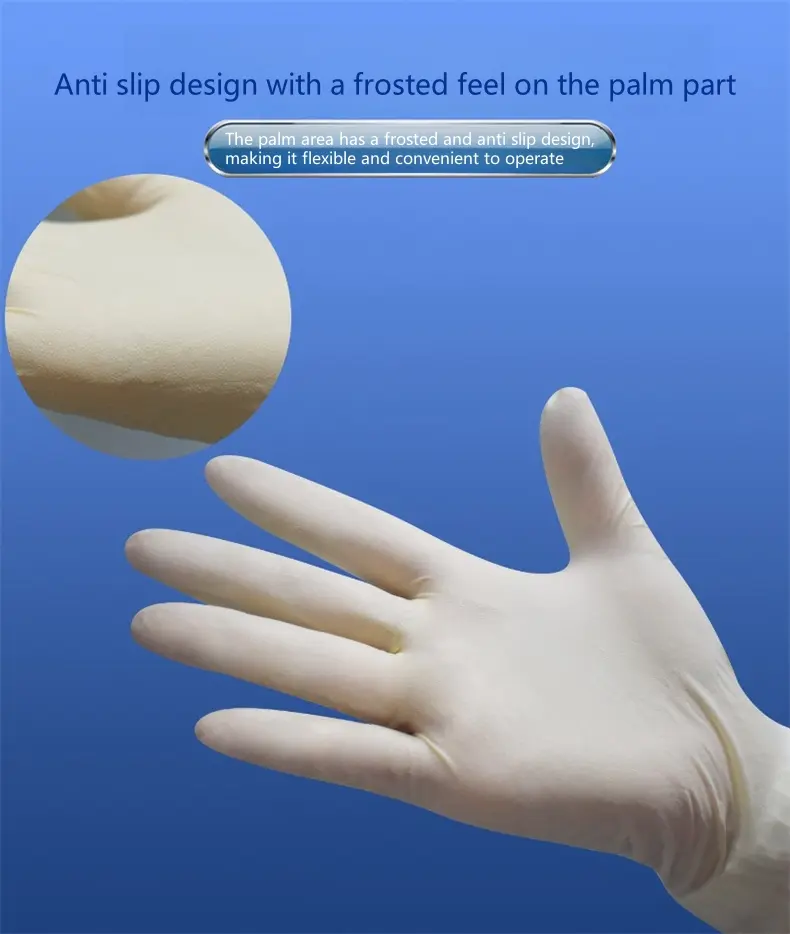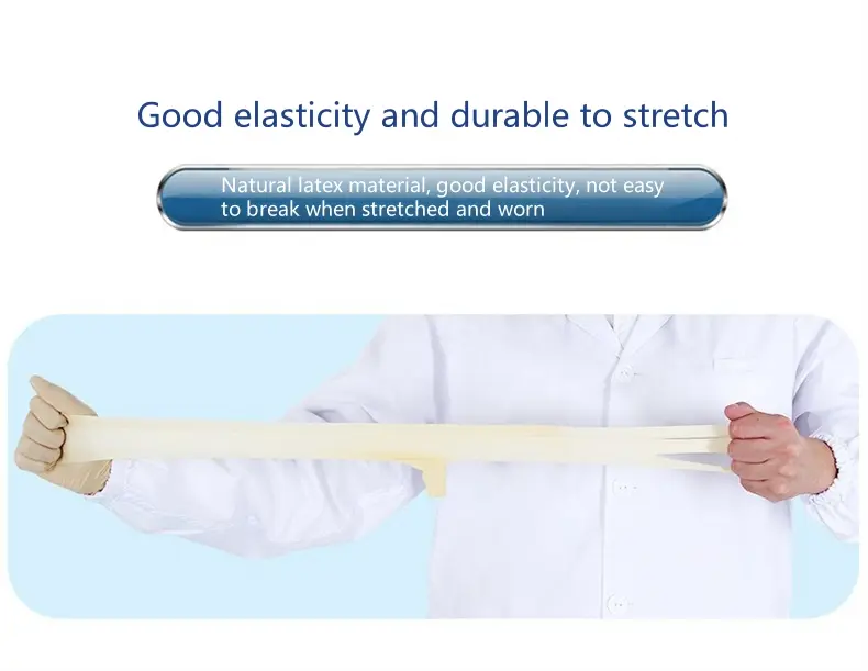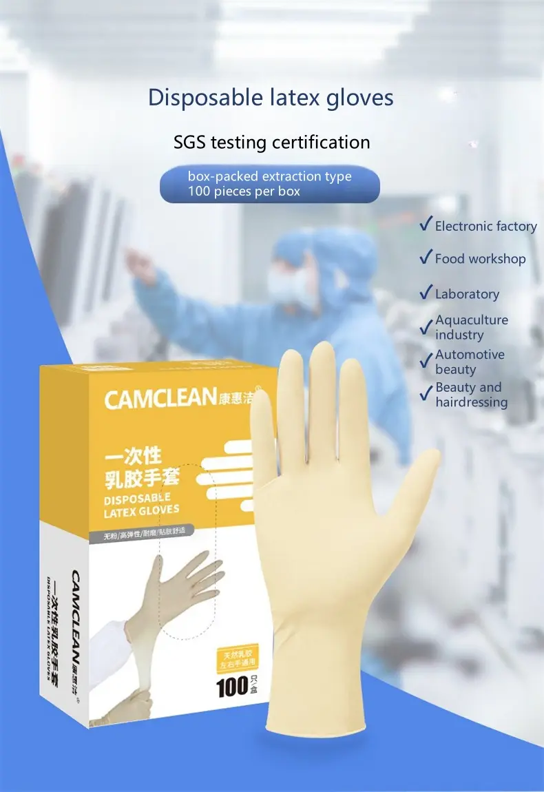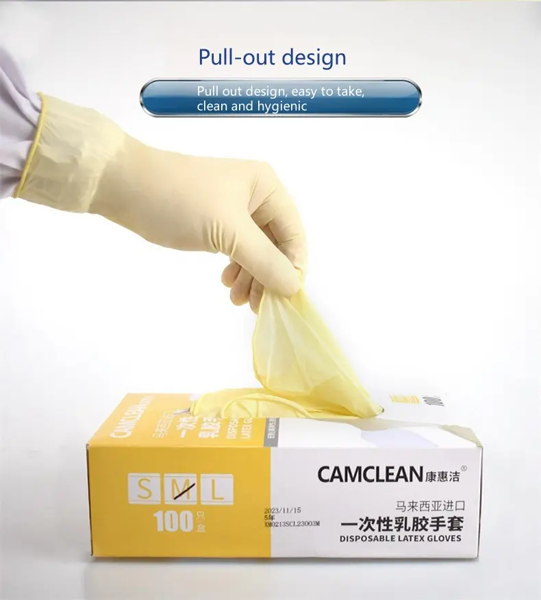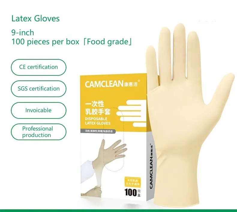 Specifications: Material: Natural latex Product color: Beige Size specifications: 9 inches (length: 23cm±2mm) Packaging specifications: 100 pieces/pack Product features: High elasticity, puncture resistance, and a textured palm for better grip Application range: Suitable for various industries including electronics, food processing, laboratories, aquaculture, automotive beauty, and hairdressing Features: |9 Inch|Hand Palm Pitted Surface|Disposable Latex Gloves| **Superior Elasticity and Durability** Crafted from premium natural latex, these disposable gloves offer exceptional elasticity and puncture resistance, ensuring a snug fit and reliable protection for your hands. The high-quality material is designed to withstand the rigors of various tasks, making it an ideal choice for professionals in industries that demand both safety and efficiency. The 9-inch length provides ample coverage, while the 23cm±2mm length be applicable a range of hand sizes, making them versatile for diverse users. **Enhanced Grip and Comfort** The unique palm pitted surface design not only adds aesthetic appeal but also enhances the grip of these gloves, ensuring a secure hold on tools and objects. The textured surface is particularly beneficial in scenarios where precision and stability are crucial, such as in food preparation or handling delicate electronic components. Despite their durability, these gloves are also lightweight, providing comfort during prolonged use without compromising on protection. **Hygienic and Convenient** The disposable nature of these gloves ensures cleanup and hygiene, making them an essential tool for maintaining a sanitary work environment. The pull-out design makes it easy for us to extract gloves, minimizing the risk of cross-contamination. With 100 pieces per pack, they are an economical choice for businesses or individuals requiring a reliable supply of disposable gloves. Please note, however, that these gloves are not suitable for individuals with latex allergies.
