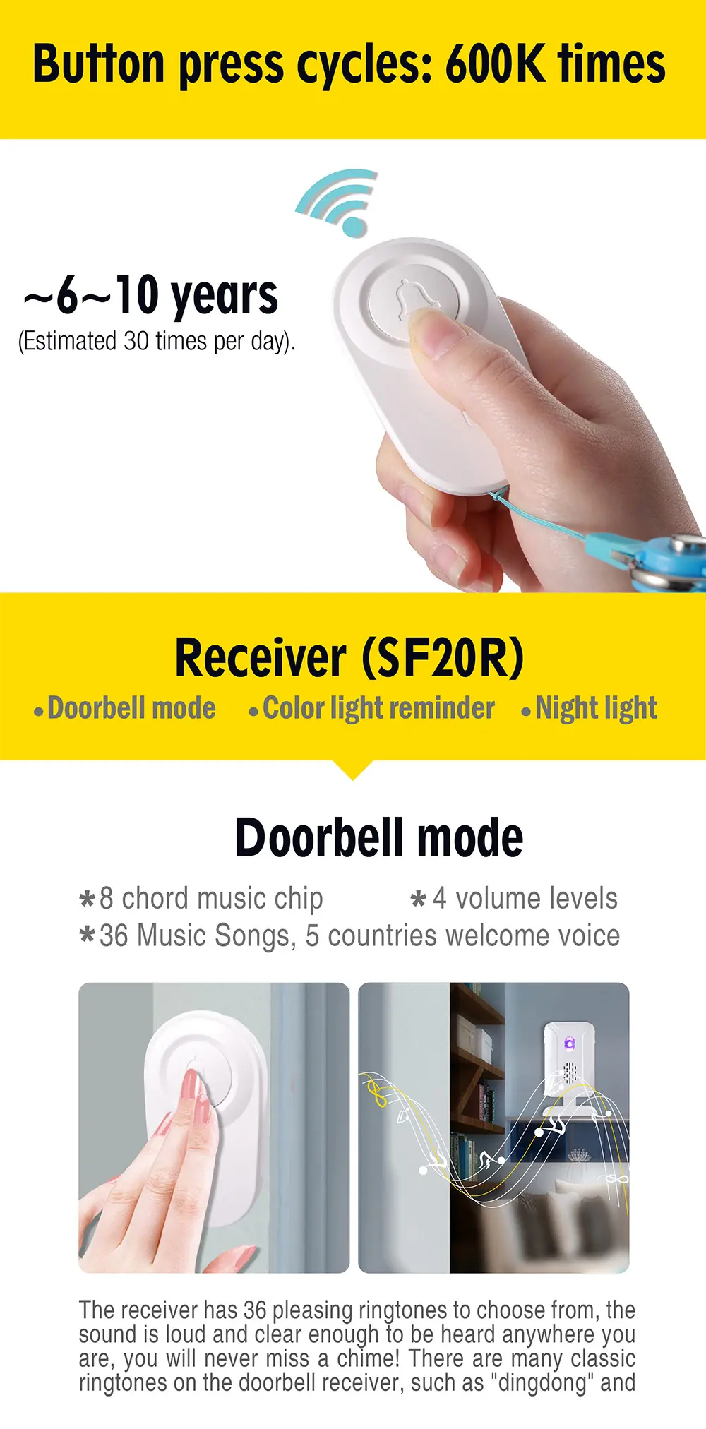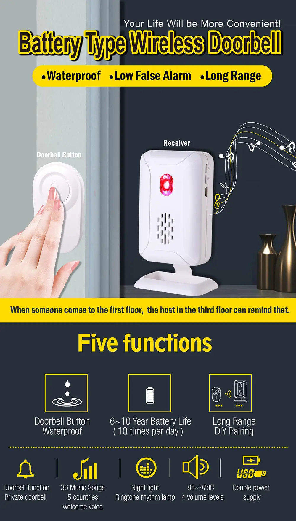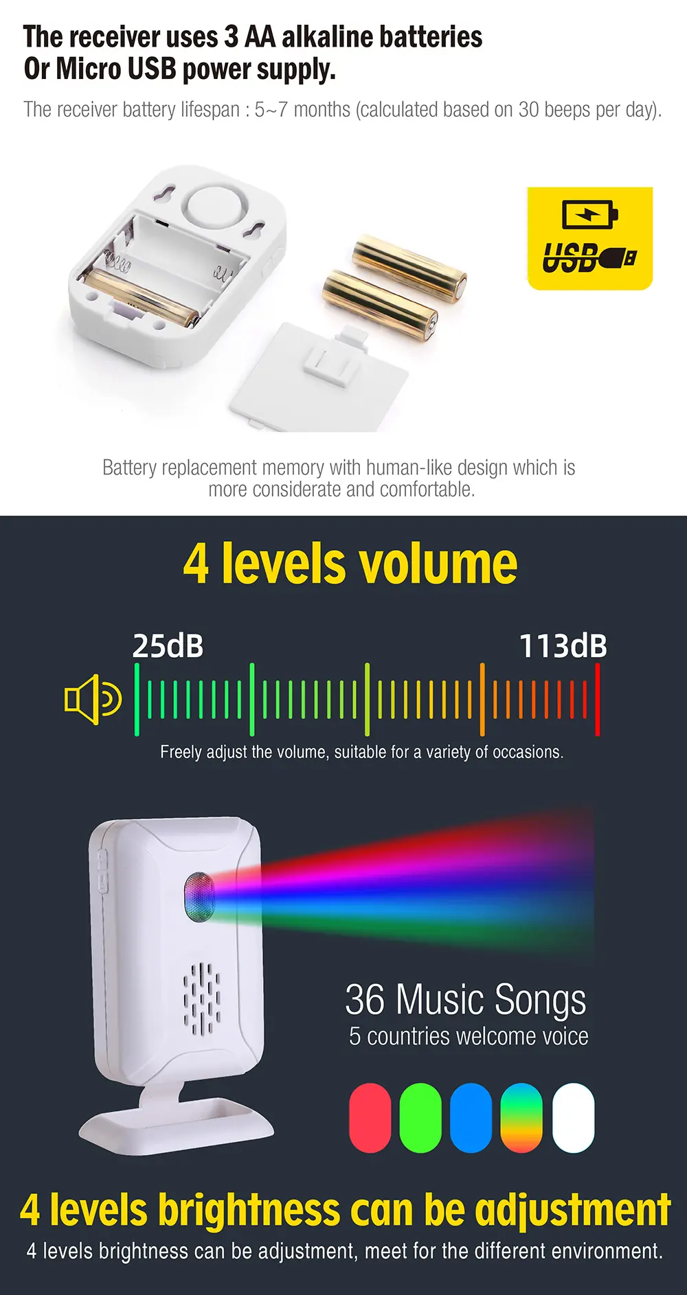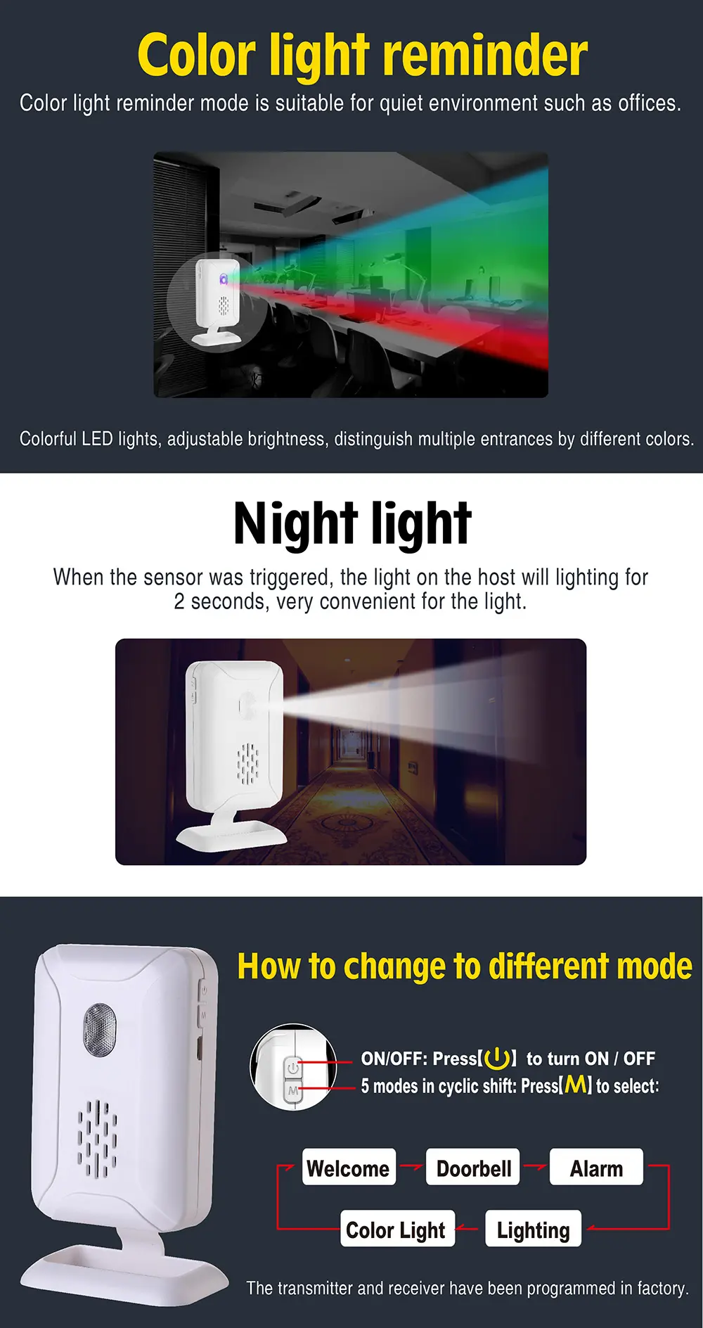 [1] Open the door to welcome guests, close the door to anti-theft thieves, five functions of welcome/doorbell/alarm/lantern/night light reminder.