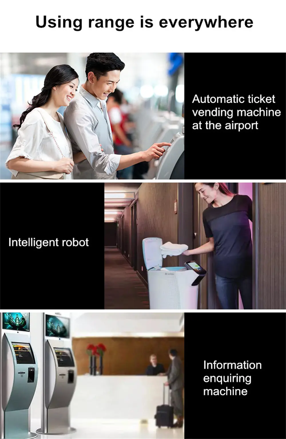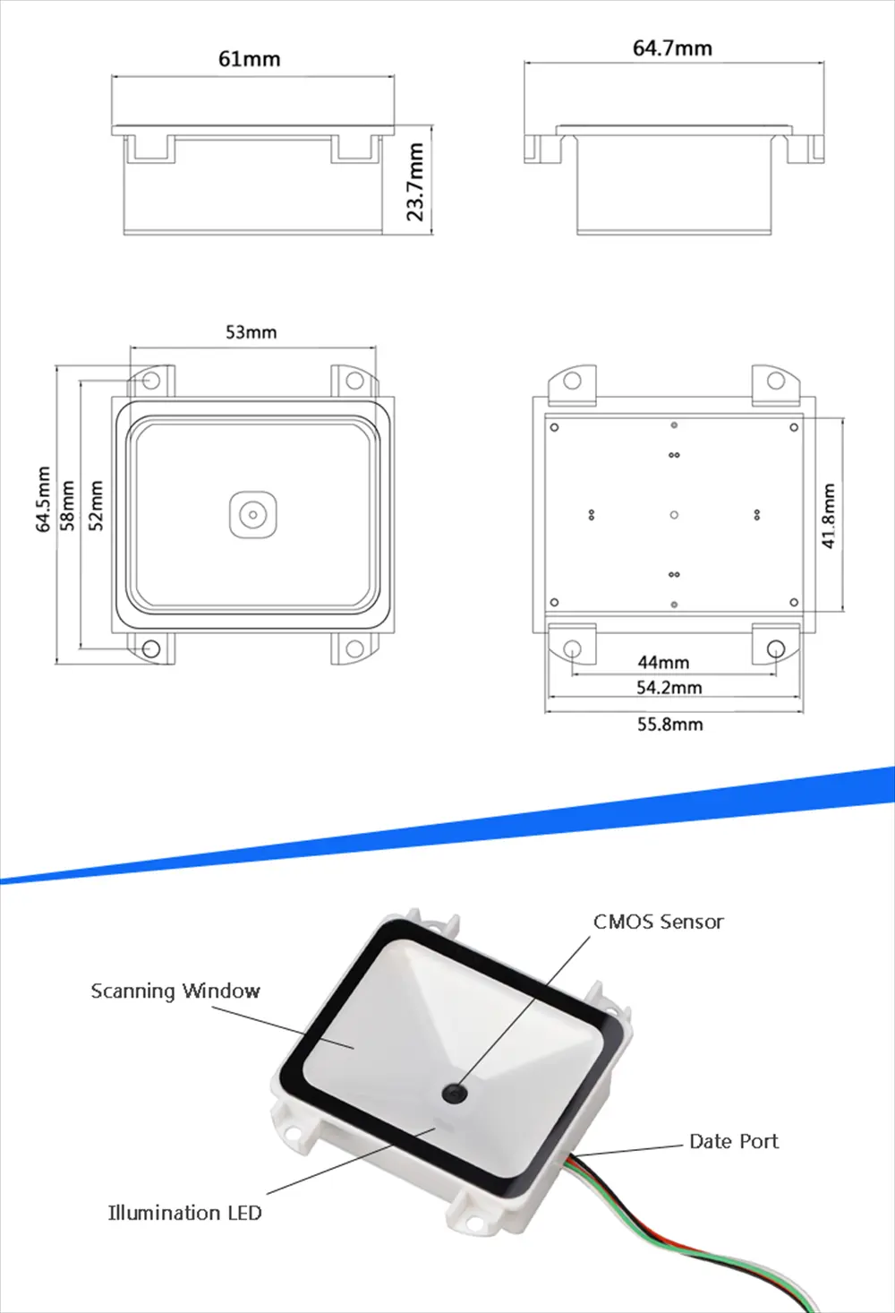 * Application fields: Electronic tickets/coupons, mobile marketing and office automation, kiosks,medical equipment,the series fixed mount barcode scanner is able to read barcodes from paper and mobile phones.