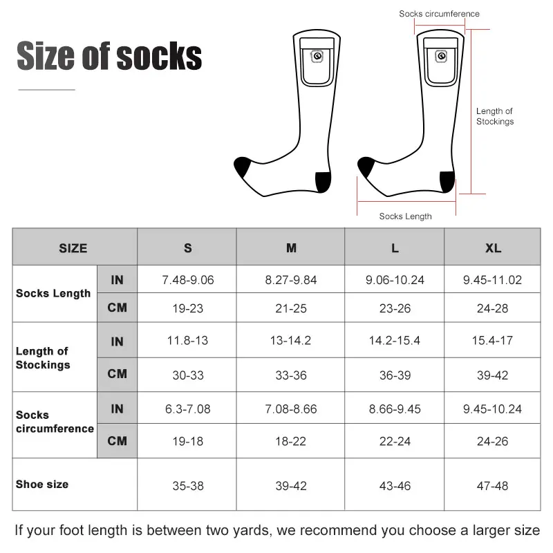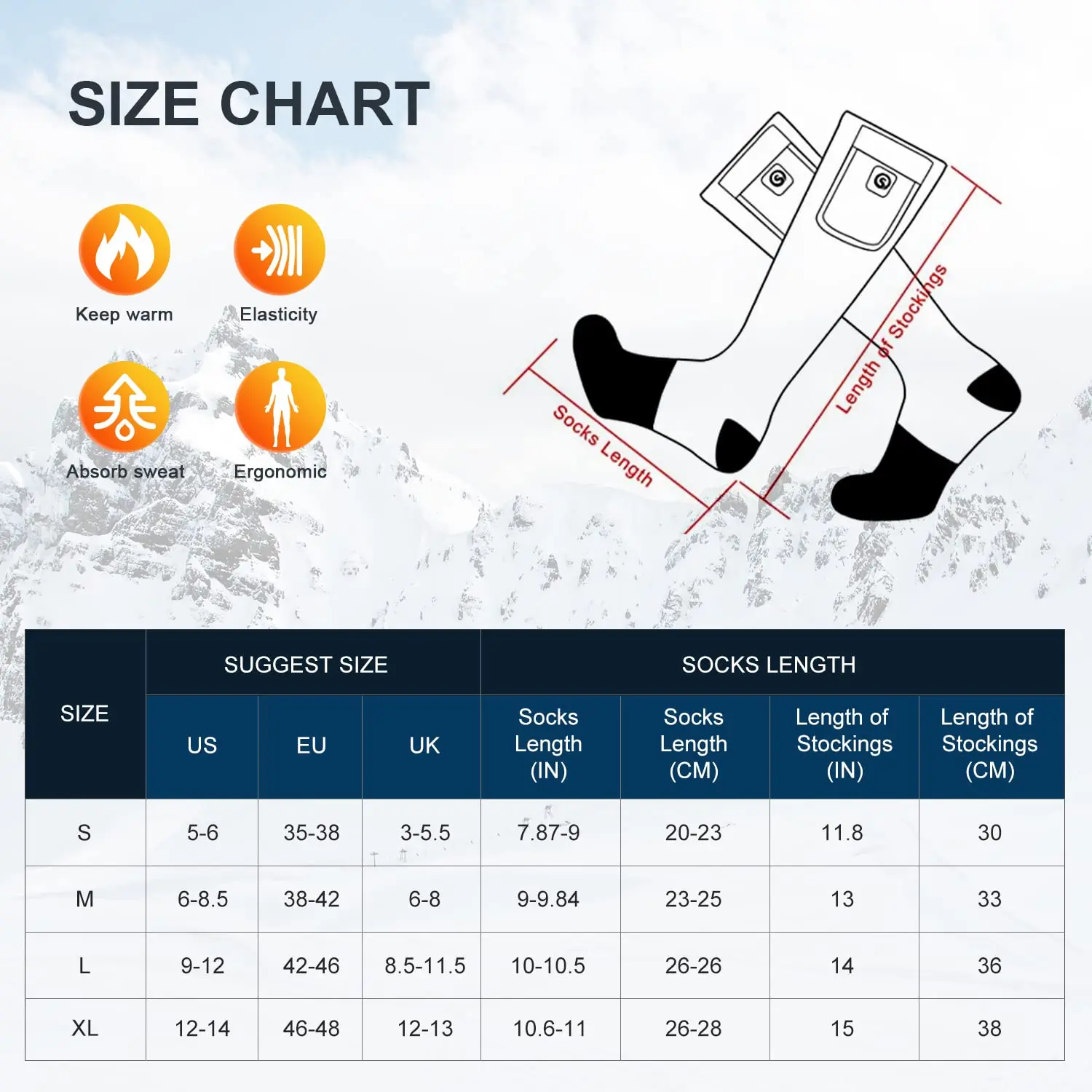 Battery Operated Heated Socks Size Chart for Men Women S: US:between 5-6, EU between 35-38 , UK between 3-3.5 |