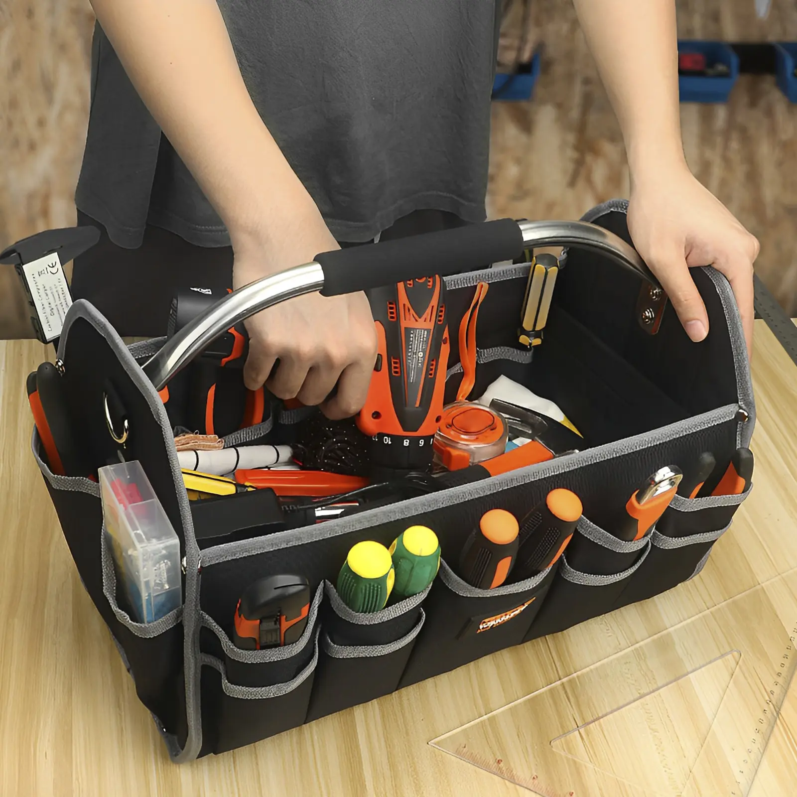 [Large Capacity and Multiple Pockets] This tool bag features multiple pockets, including side sides, to keep tools organized and accessible. The metal handle of the middle beam has stronger support and is easy to move the tool bag.