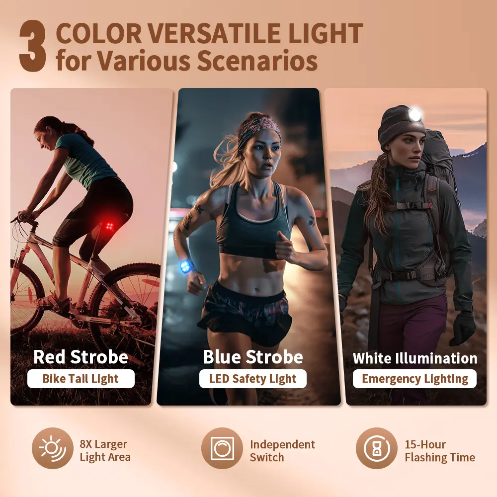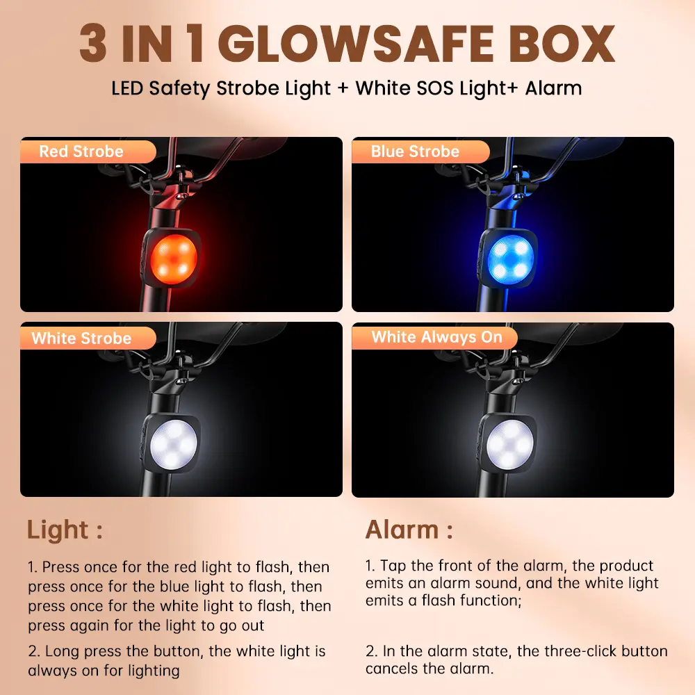 In normal mode of LED lights: red light, blue light, white light flashing, and white light constantly on are used for lighting purposes; Red, blue, and white can be changed by button switching, and the white light can be long pressed to remain on;
