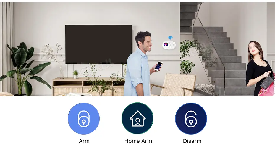 With a free IOS/Android smartphone app, it can be easily controlled by arming, disarming, and home modes with also a simple remote control & RFID Card