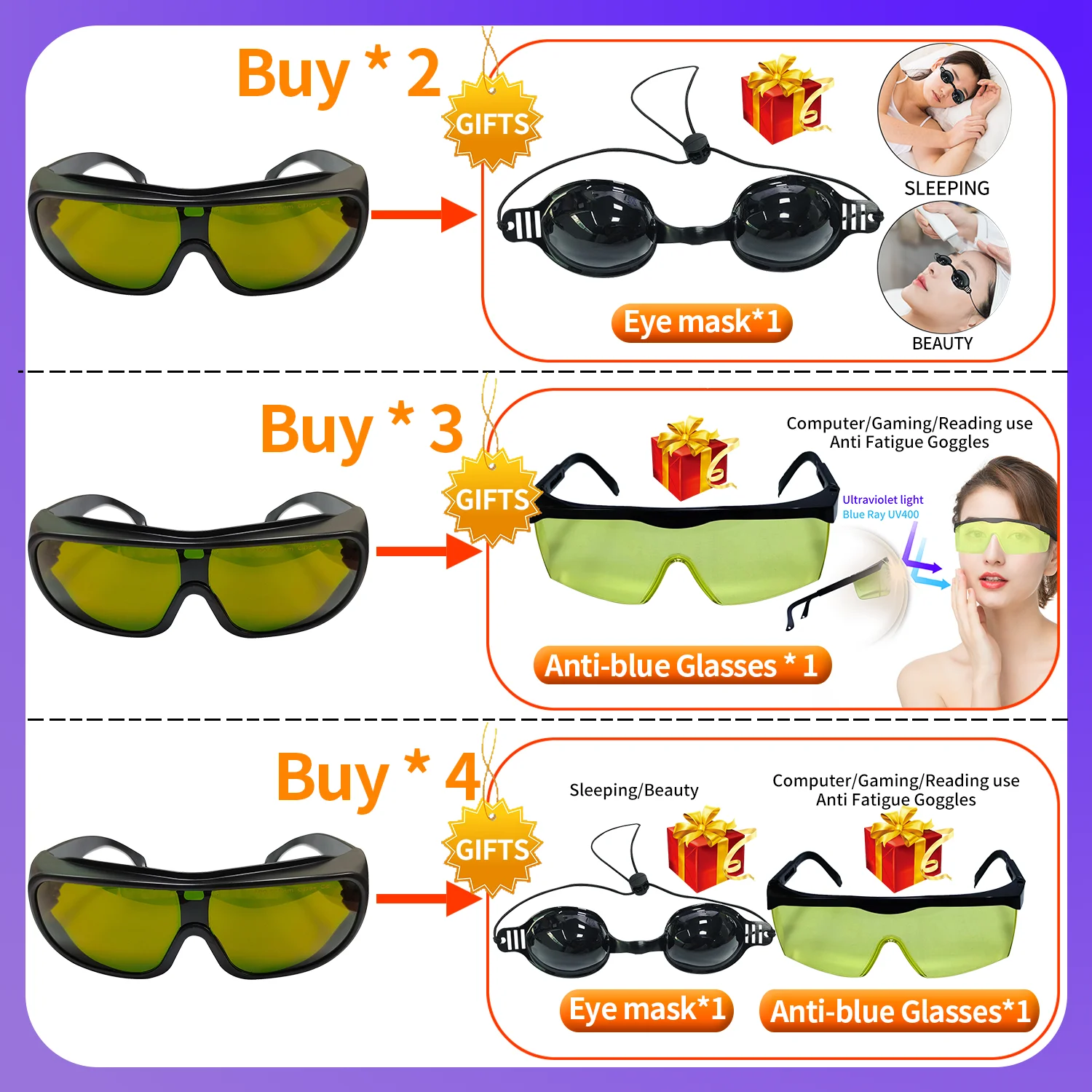 4, Buy 4 Glasses and get the following gift with a pair of Eye Mask and Anti-blue light goggles
