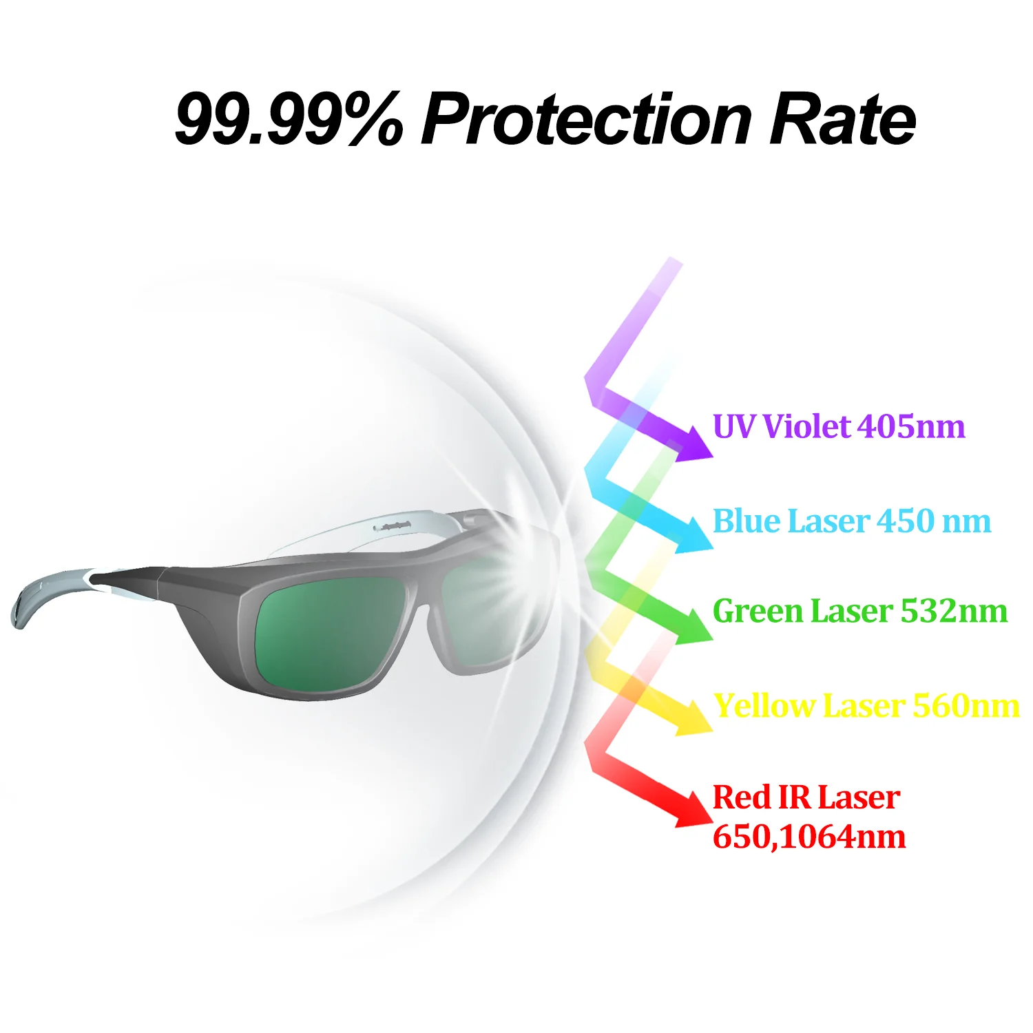 In the ultraviolet range 400—315nm,315—280nm,280—190nm,(UV-A, UV-B, UV-C), the glasses offer protection against low to medium radiation sources.