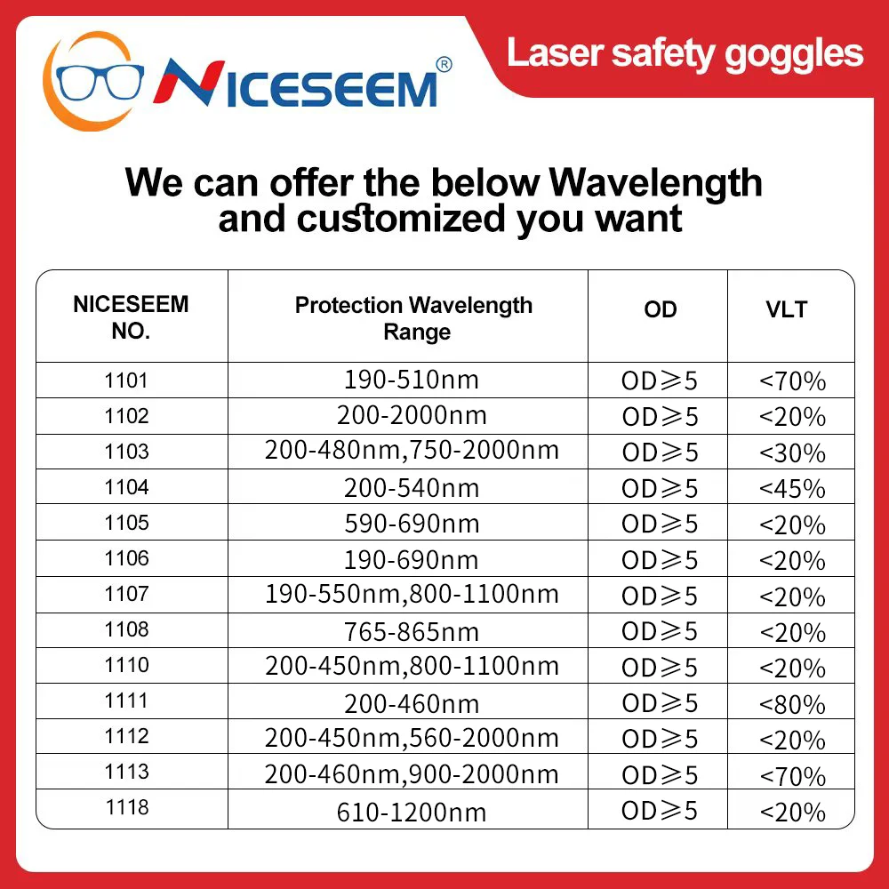 We offer 14 different laser wavelengths of goggles, please refer to the parameter table below to select the most suitable band.
