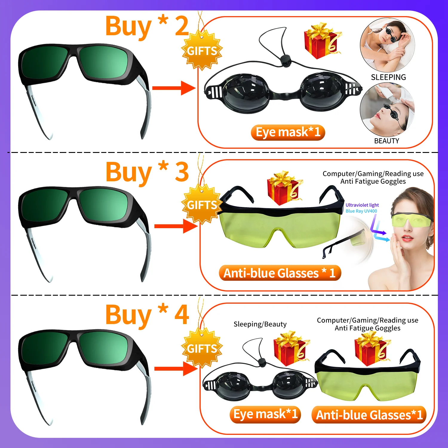 4, Buy 4 Glasses and get the following gift with a pair of Eye Mask and Anti-blue light goggles