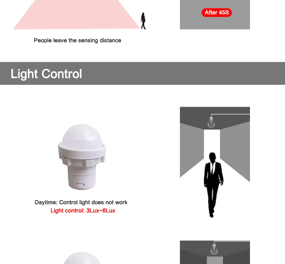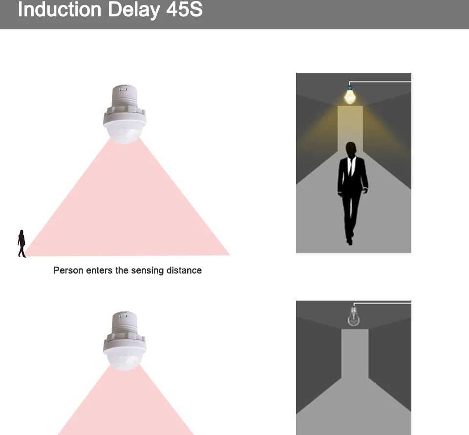 The human body induction switch is an intelligent infrared detection sensor, which uses infrared detection to control the load switch. The light is turned on and off by detecting the temperature of the human body. When someone approaches, the sensing device will be triggered to start working. After the person leaves the sensing area, the sensing device will automatically turn off after the set time. Ensure that the light is on when the person comes. The light is off. Realize the effect of energy saving and energy saving to the greatest extent. Users can install the human body sensor in the appropriate environment according to actual needs (such as ceiling lamp, bathroom, kitchen, balcony, warehouse, corridor, staircase, garage, etc., which do not require long lighting Place (with light perception, working in dark).