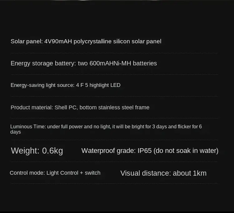 1. Polycrystalline silicon solar panels 1) 0.3W 4V 90MA power storage, high photoelectric conversion rate. 2) The switch has a rain-proof design, please keep it open for installation.