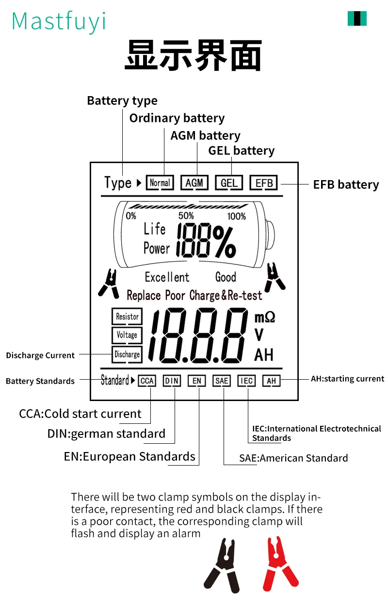 Please be kindly noted,the listed product is produced and distributed abroad and subject to the laws of its country of origin。Battery tester is a special measuring instrument for starting leadacid batteries to measure and analyze battery performance. The instrument has a simple appearance, compact design, easy operation, accurate measurement, and the measurement results can be obtained at any time without observing the readings, which meets the modern way of use. This instrument applies four-wire measurement method, combined with self-developed core circuit and software algorithms, to realize accurate measurement, strong protections, wire clip contact failure reminder and other functions, so that the user can use more assured, safer operation. This instrument is suitable for all kinds of leadacid battery testing occasions in accordance with the standards.