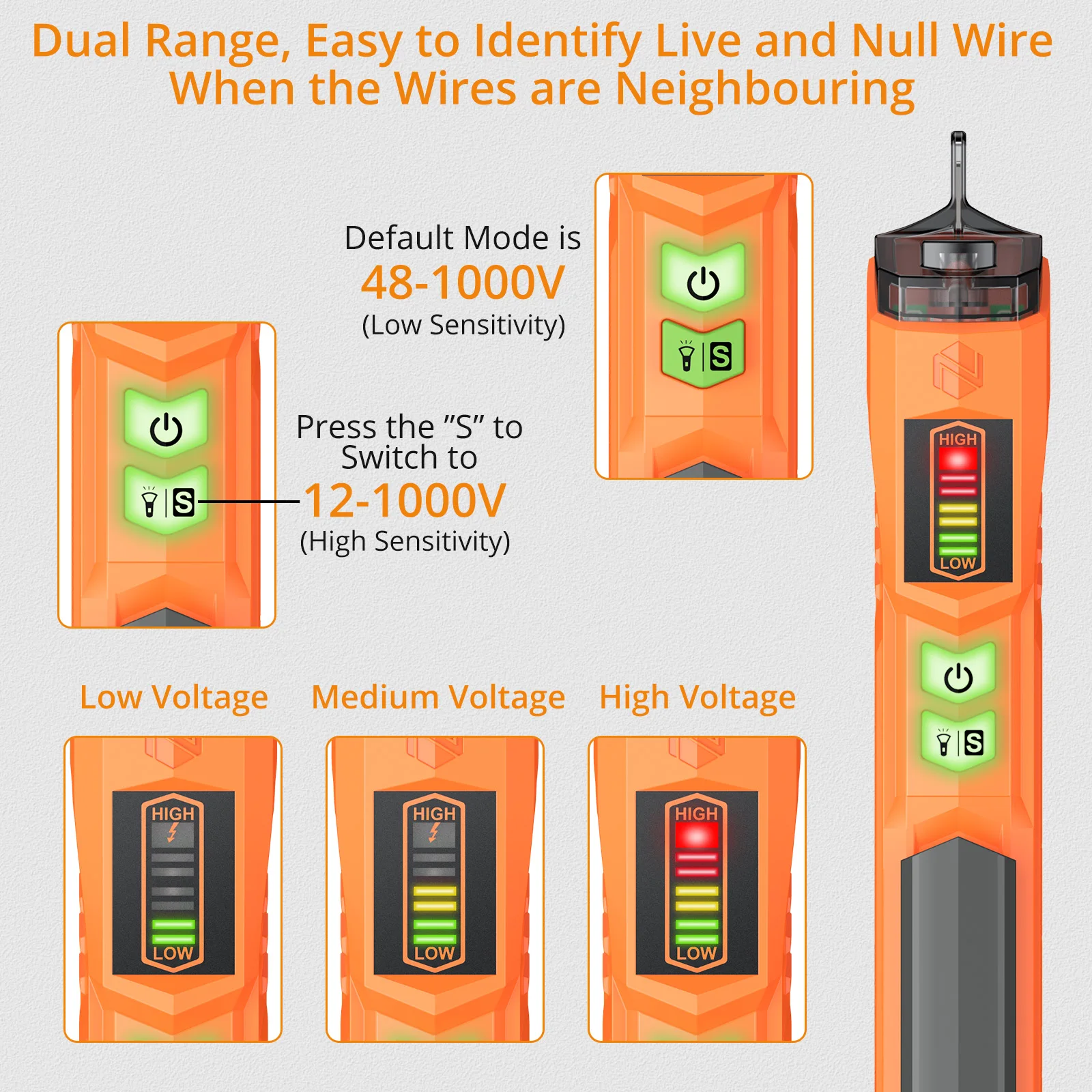 Non Contact Voltage Tester 12-1000V/48-1000V Adjustable Sensitivity AC Voltage Detector Tester Pen LED Flashlight