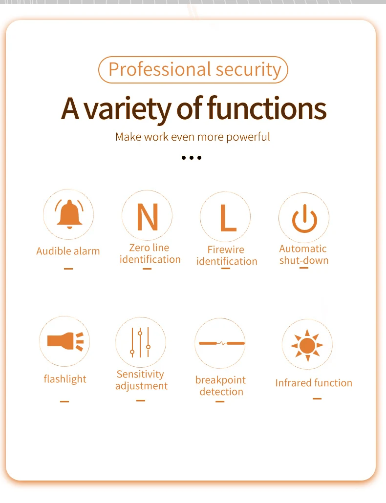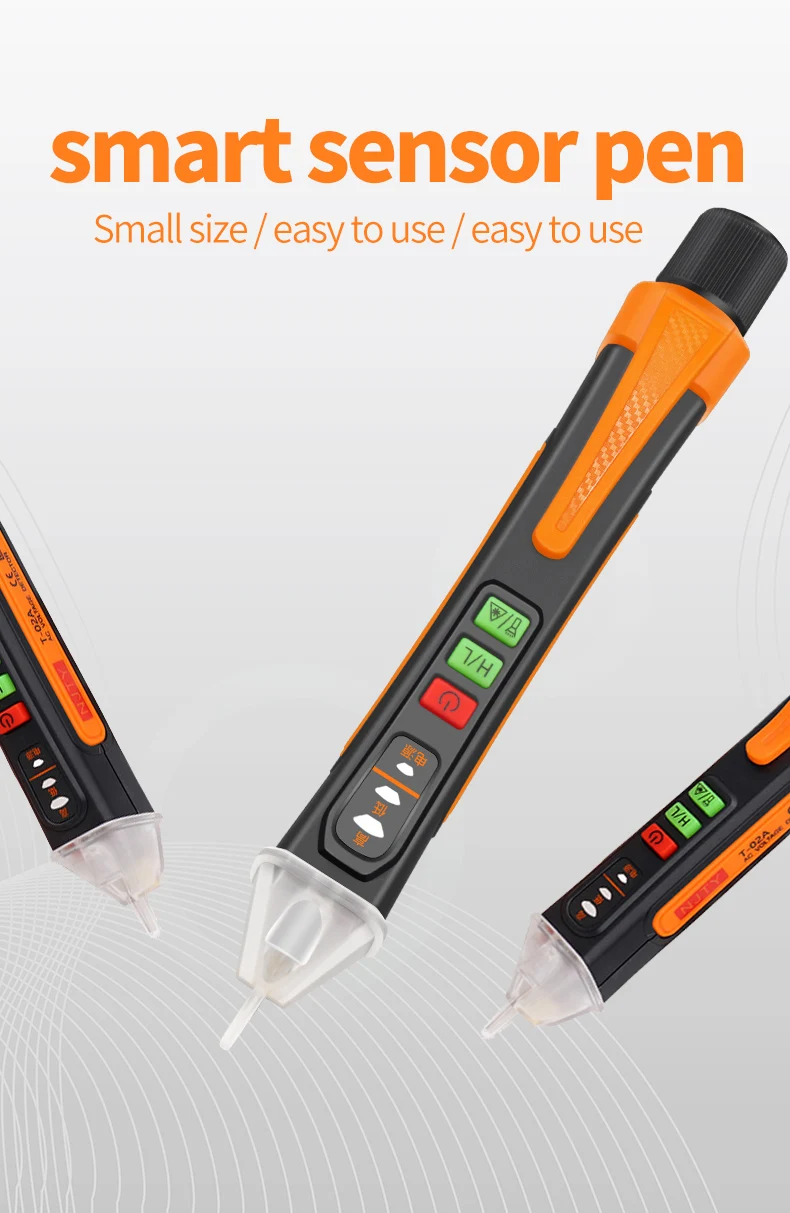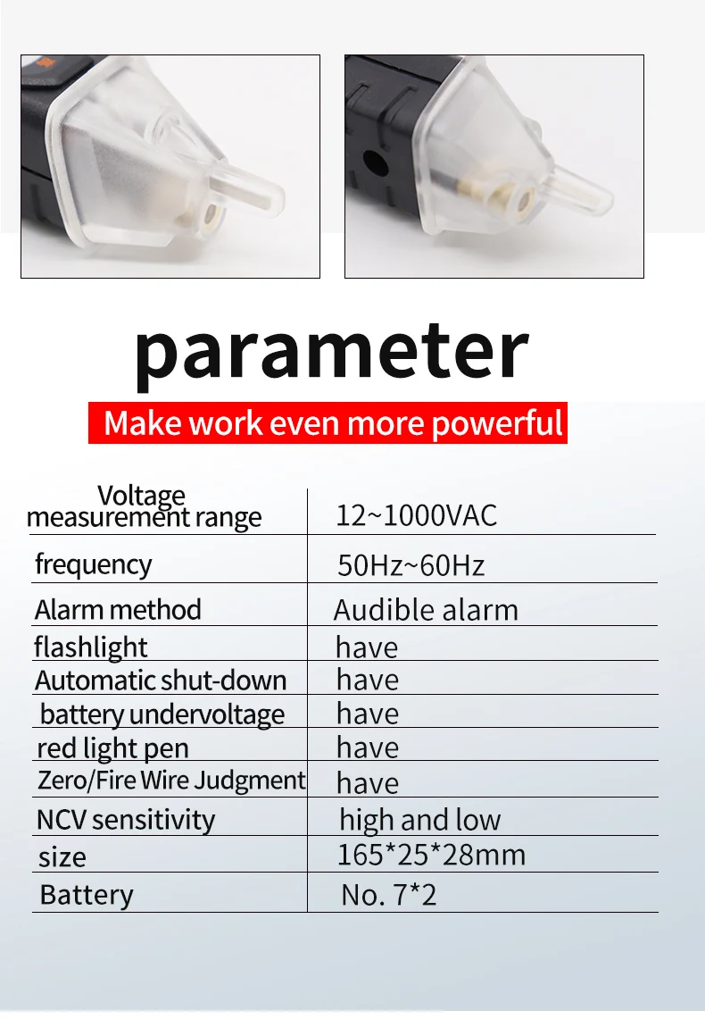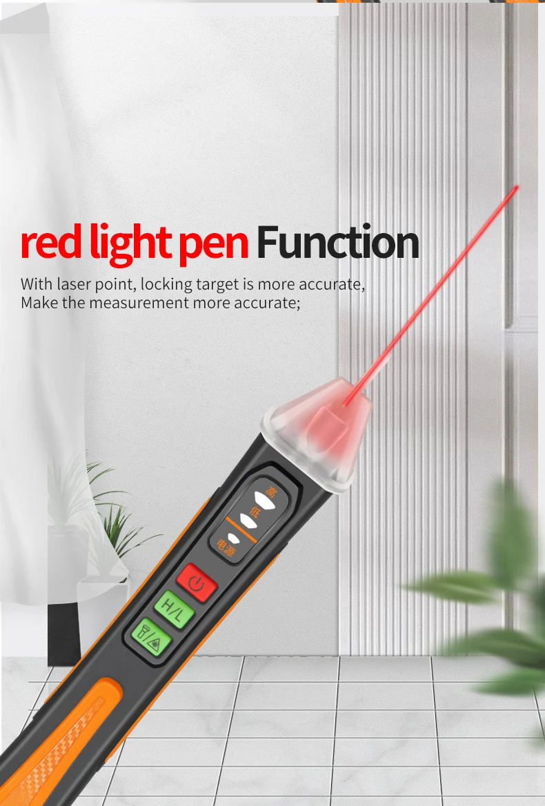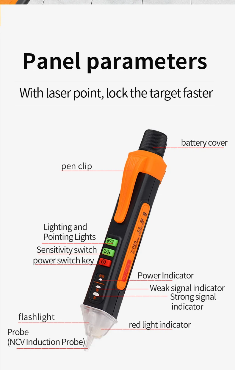 The high sensitivity range is 12-1000v (only when the H/L lamp is on) and the low sensitivity range is 48-1000v (default mode); LED flashing alarm, neutral or weak electricity can only trigger yellow light, only high electricity can trigger red light; Illumination light (press the light key to open);