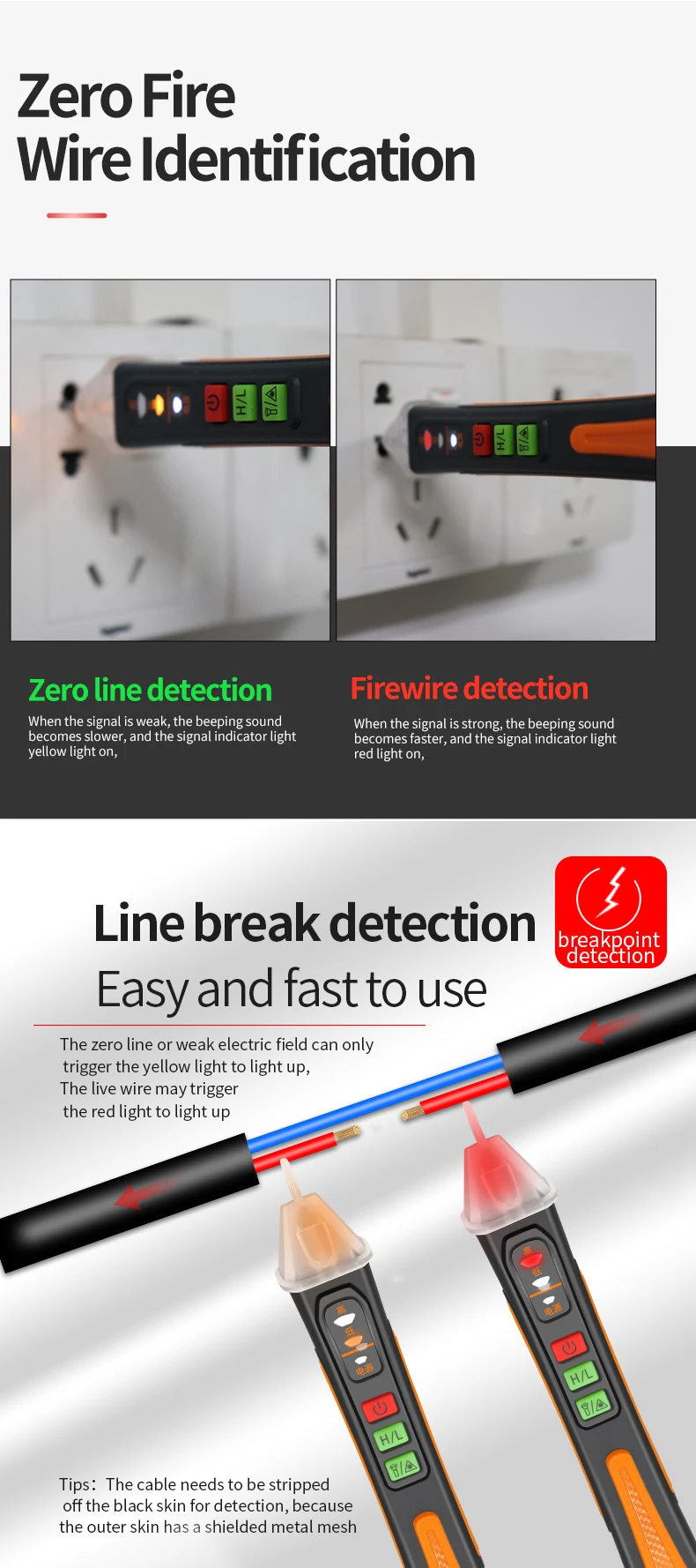 This product can detect whether wires are charged (alternating current), and is suitable for home circuit maintenance and production electricity detection.