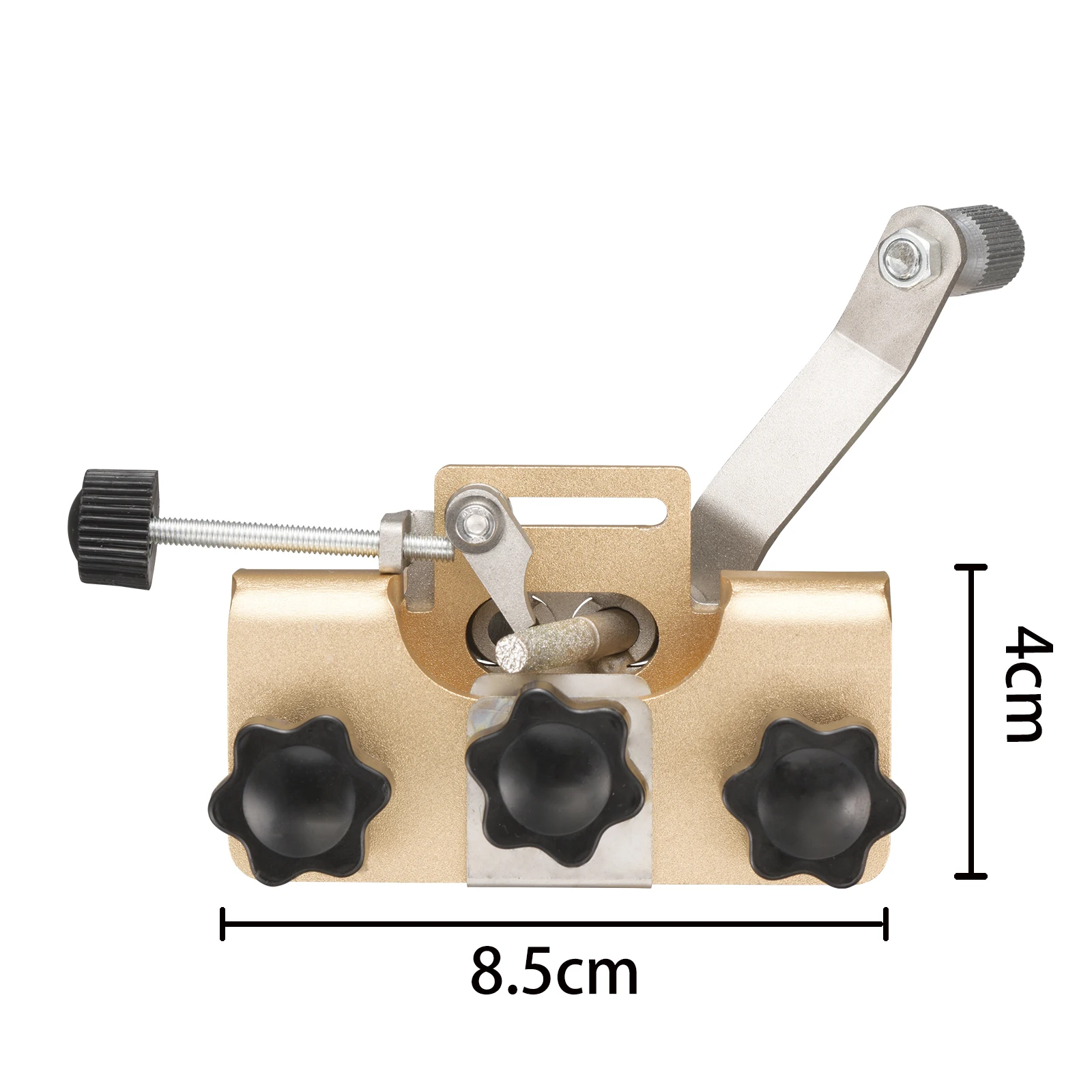 It is as easy to use as a pencil sharpener; just set the clamp to the rod, position the pawl on the tooth, insert the burr into the guide sleeve, and turn the handle.